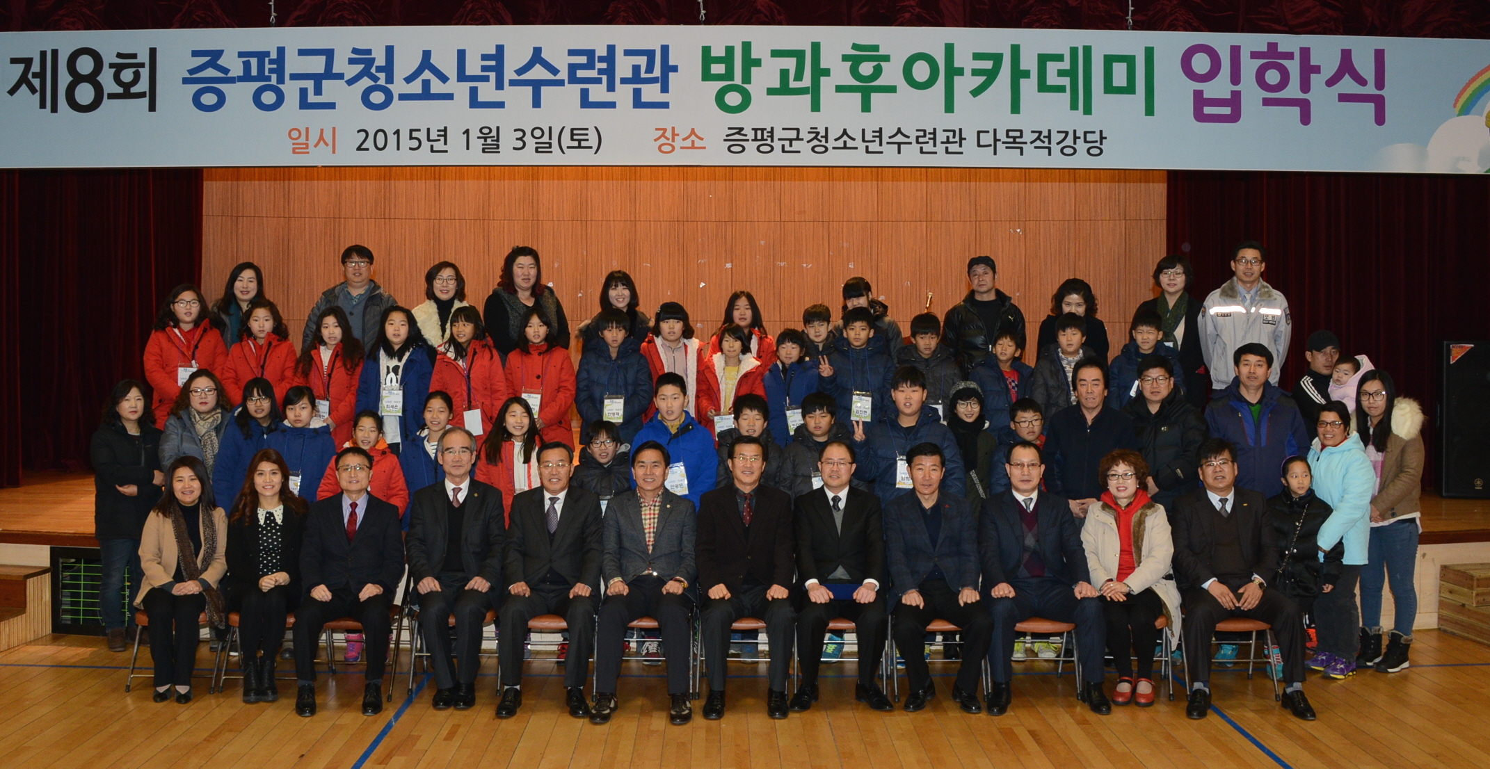 제8회 증평군청소년수련관 방과후아카데미 입학식이 홍성열군수, 지영섭군의장을 비롯한 기관단체장과 학생 및 학부모 등 100여명이 참석한 가운데 3일 오전10시 청소년수련관 다목적강당에서 열렸다.