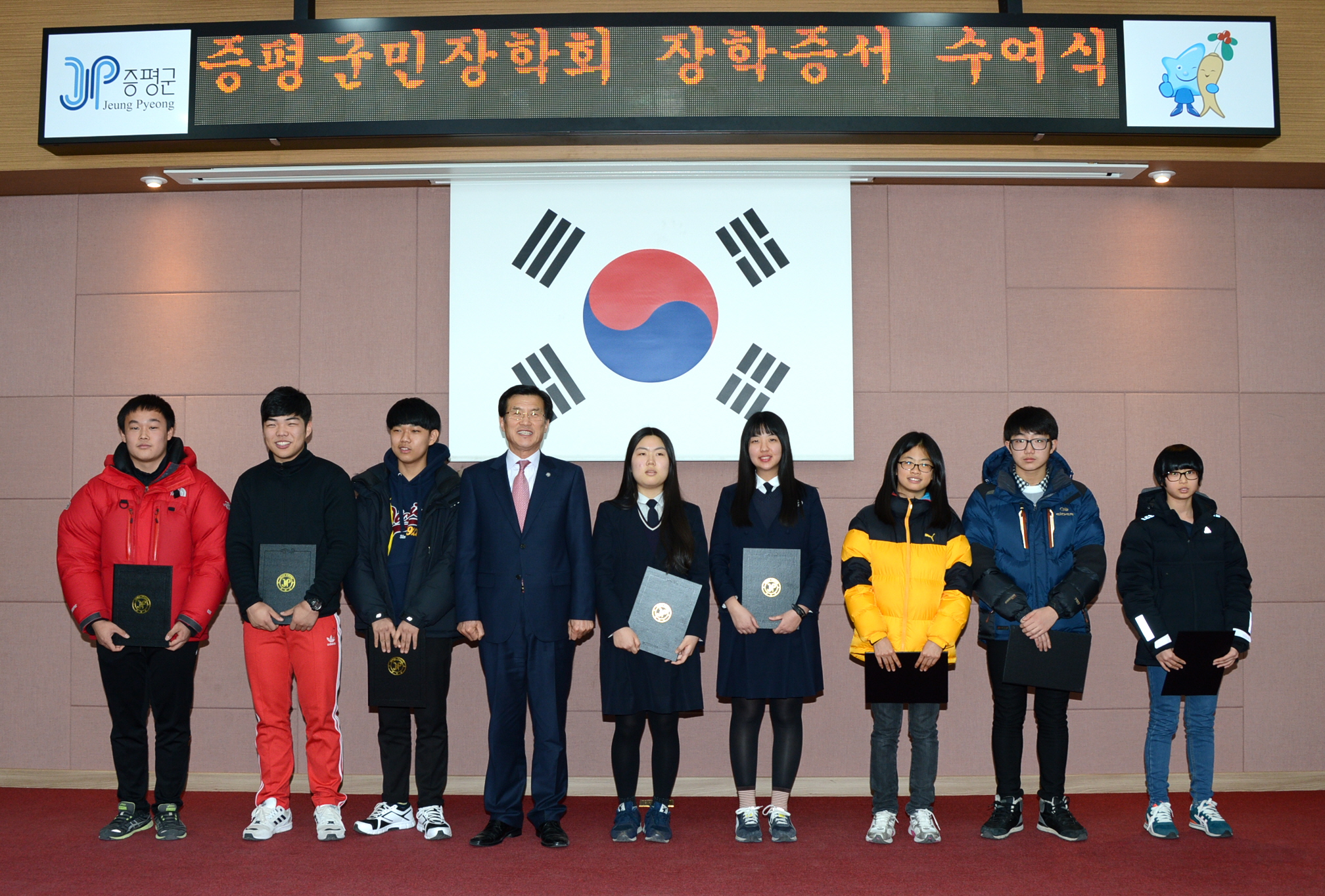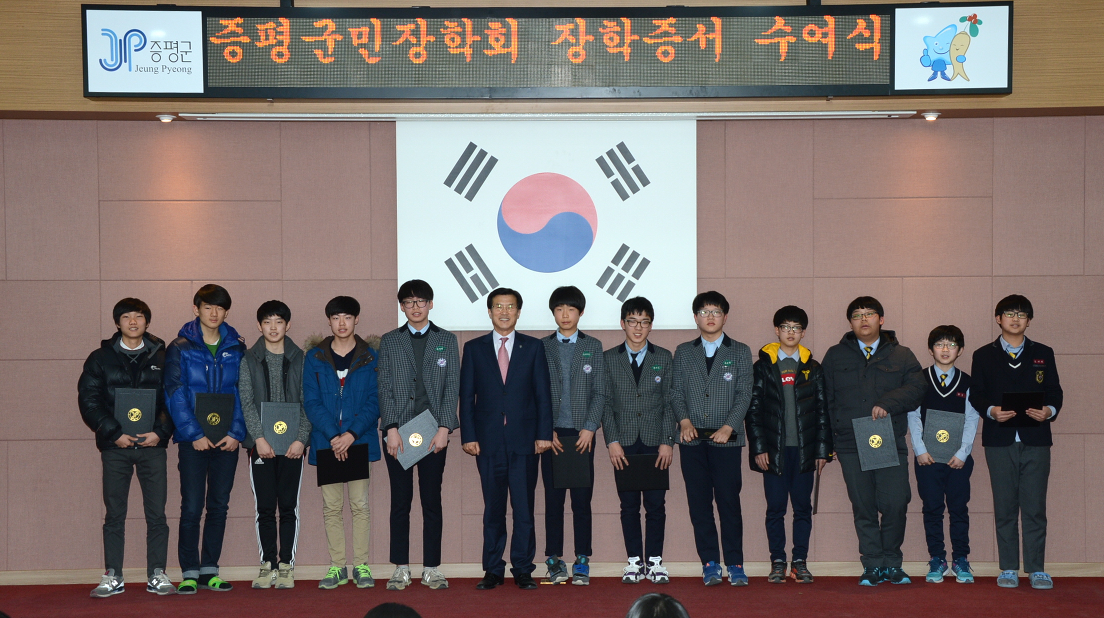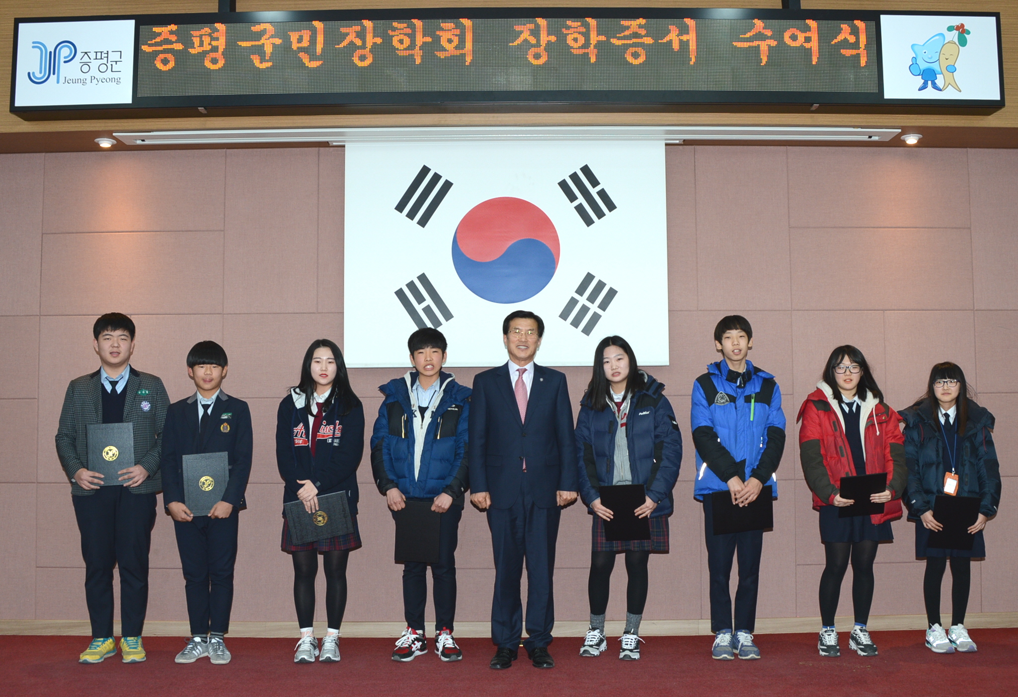 재단법인 증평군민장학회(이사장 홍성열 증평군수)가 9일 군청 대회의실에서 2015년 장학생 장학증서 수여식을 가졌다. [보도자료실 참조. 사진은 6일 장학증서 전달 모습]
