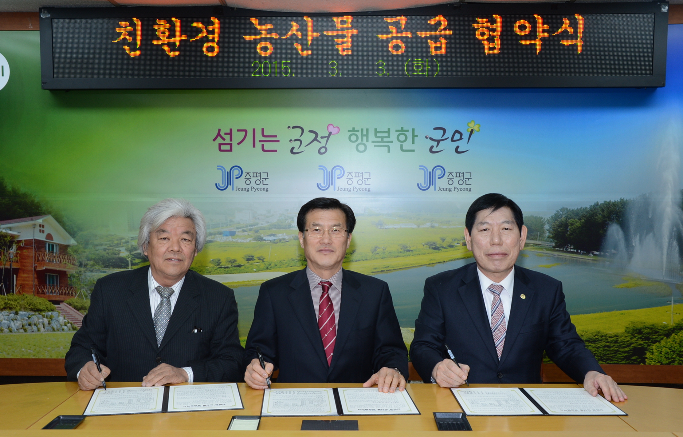 증평군(군수 홍성열)과 괴산증평교육지원청(교육장 김창호), 정창수 증평친환경영농조합법인 대표는 3일 군청2층 소회의실에서 2015년도 학교급식지원 일환으로 의무교육대상 무상급식비 및 학교급식용 친환경 우수농산물 지원을 위한 협약식을 가졌다. [보도자료실 참조]
