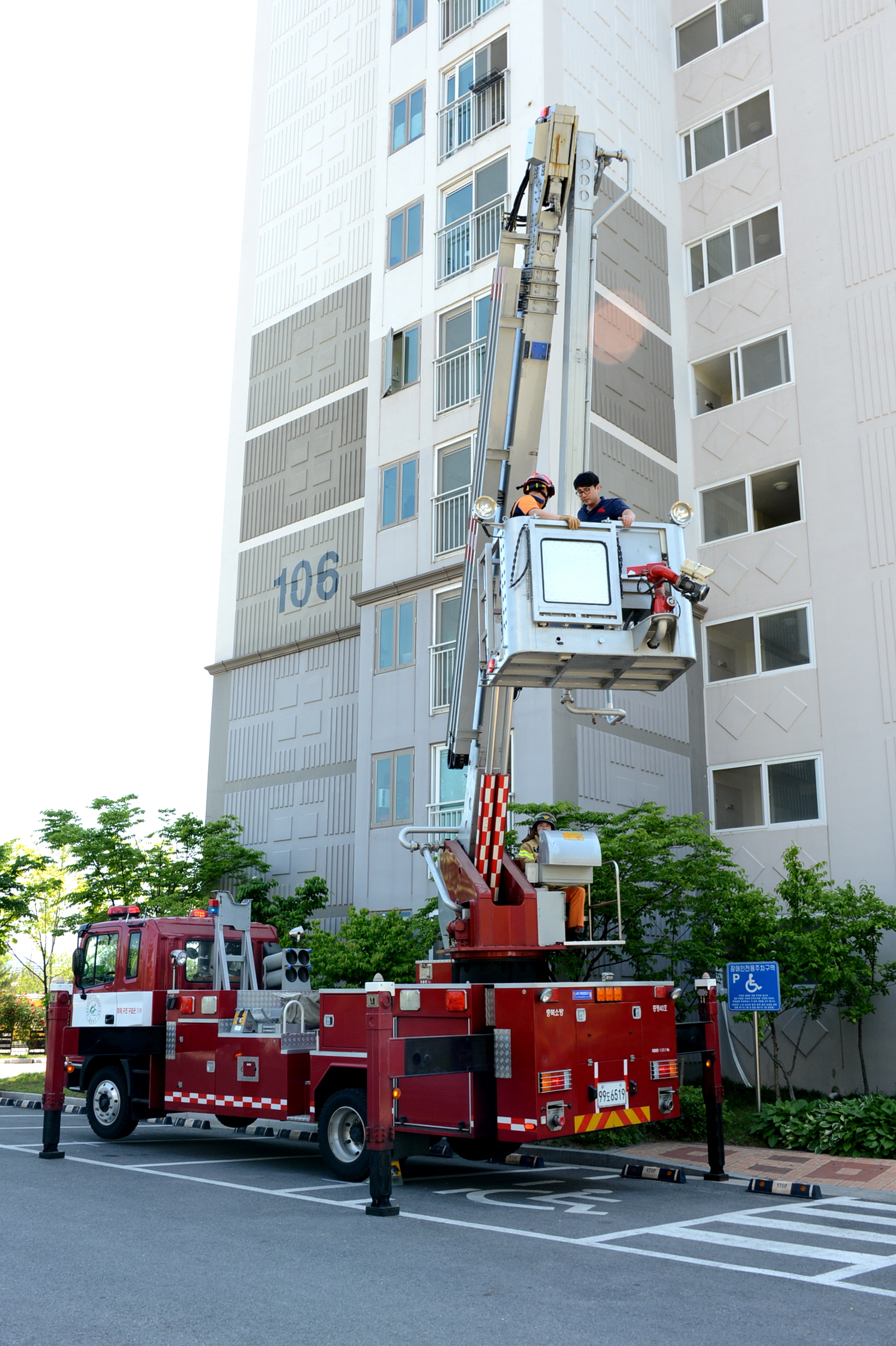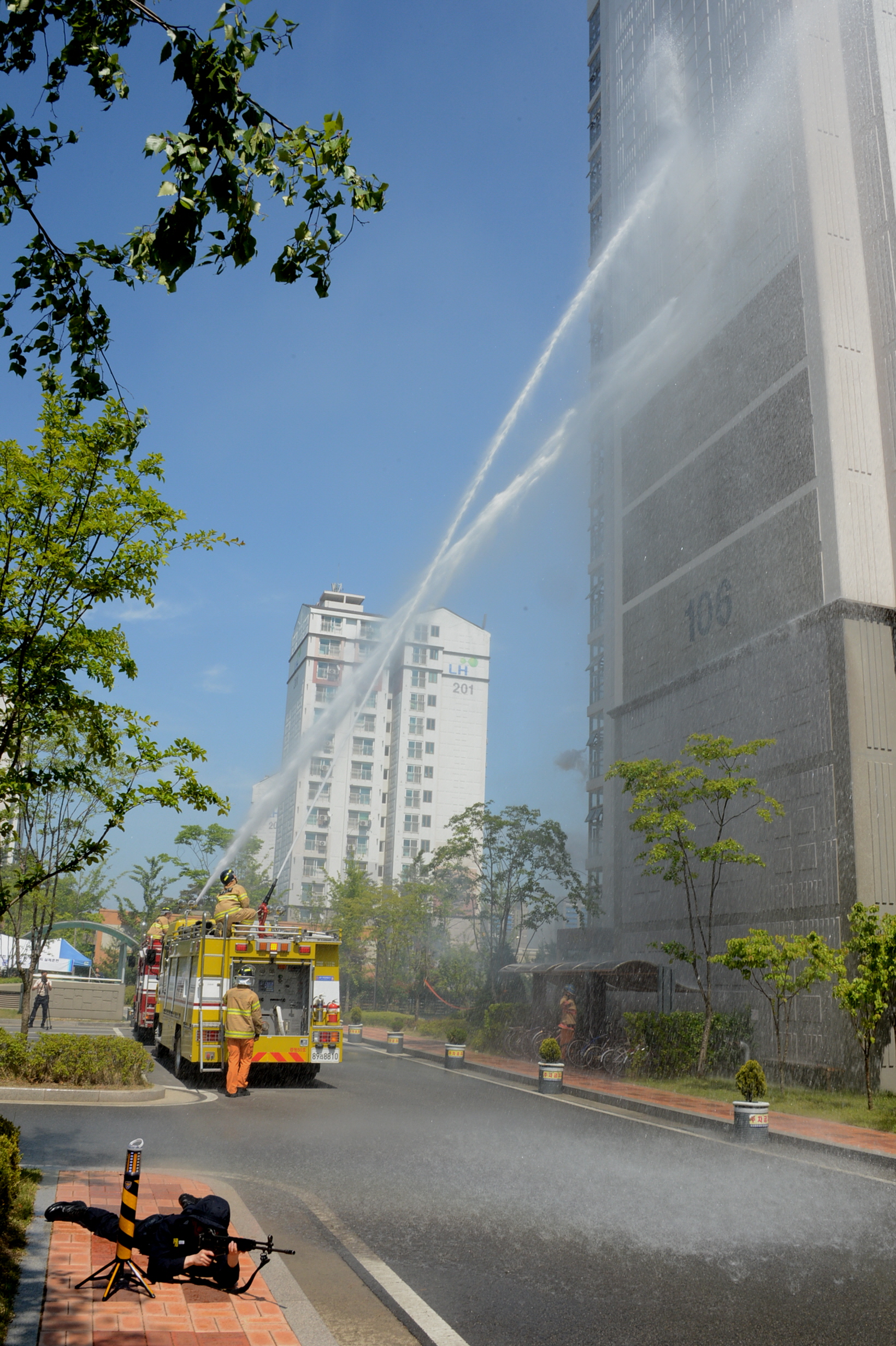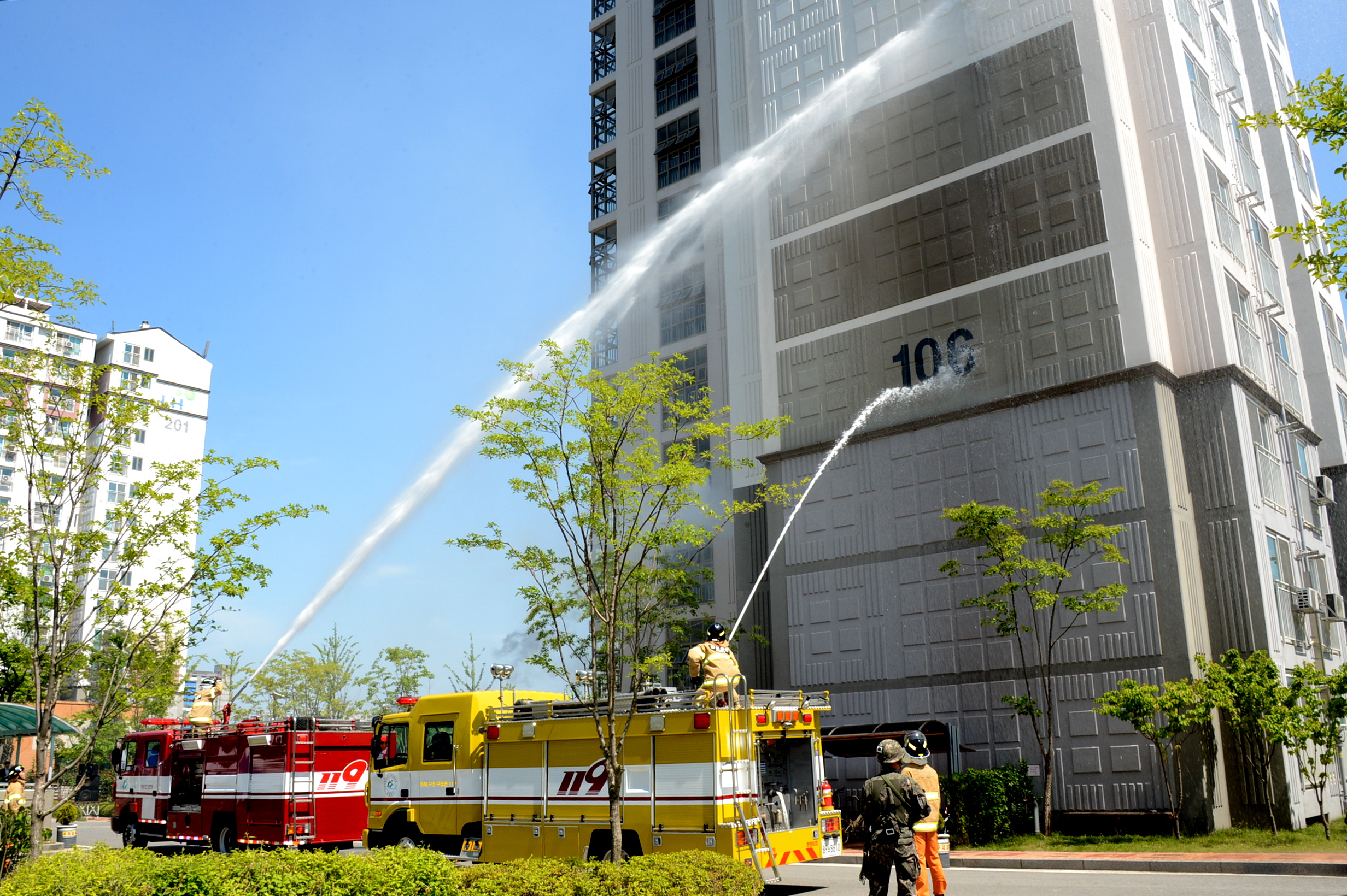 증평군은 21일 오후2시 증평읍 송산리 휴먼시아 1차 아파트에서 고층아파트 피폭에 따른 화재진압 및 주민대피 훈련을 실시했다. [보도자료실 참조]