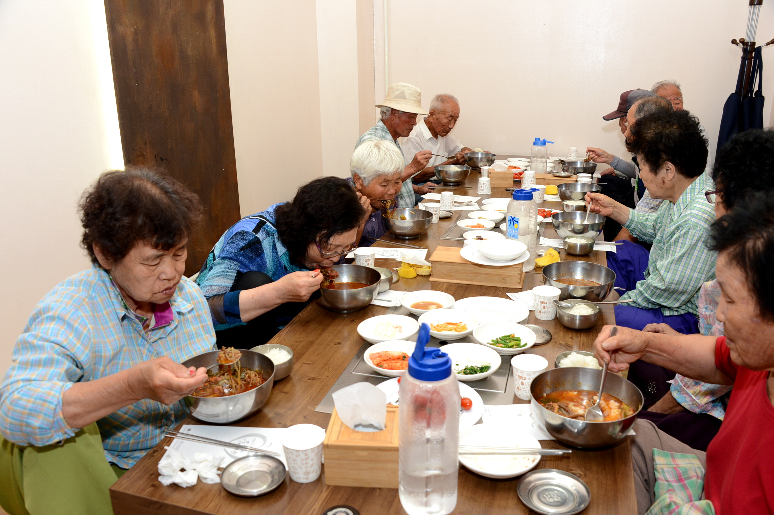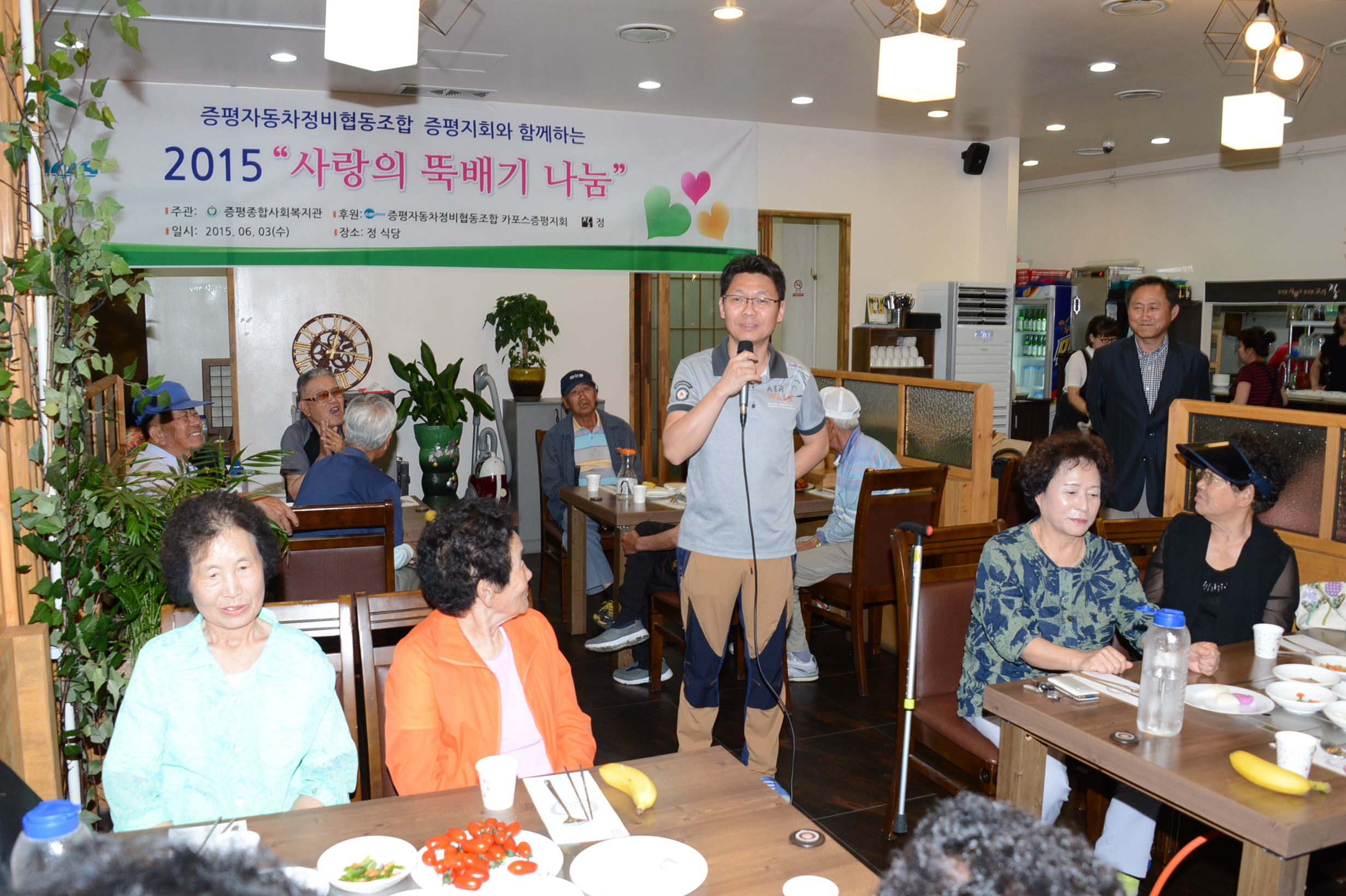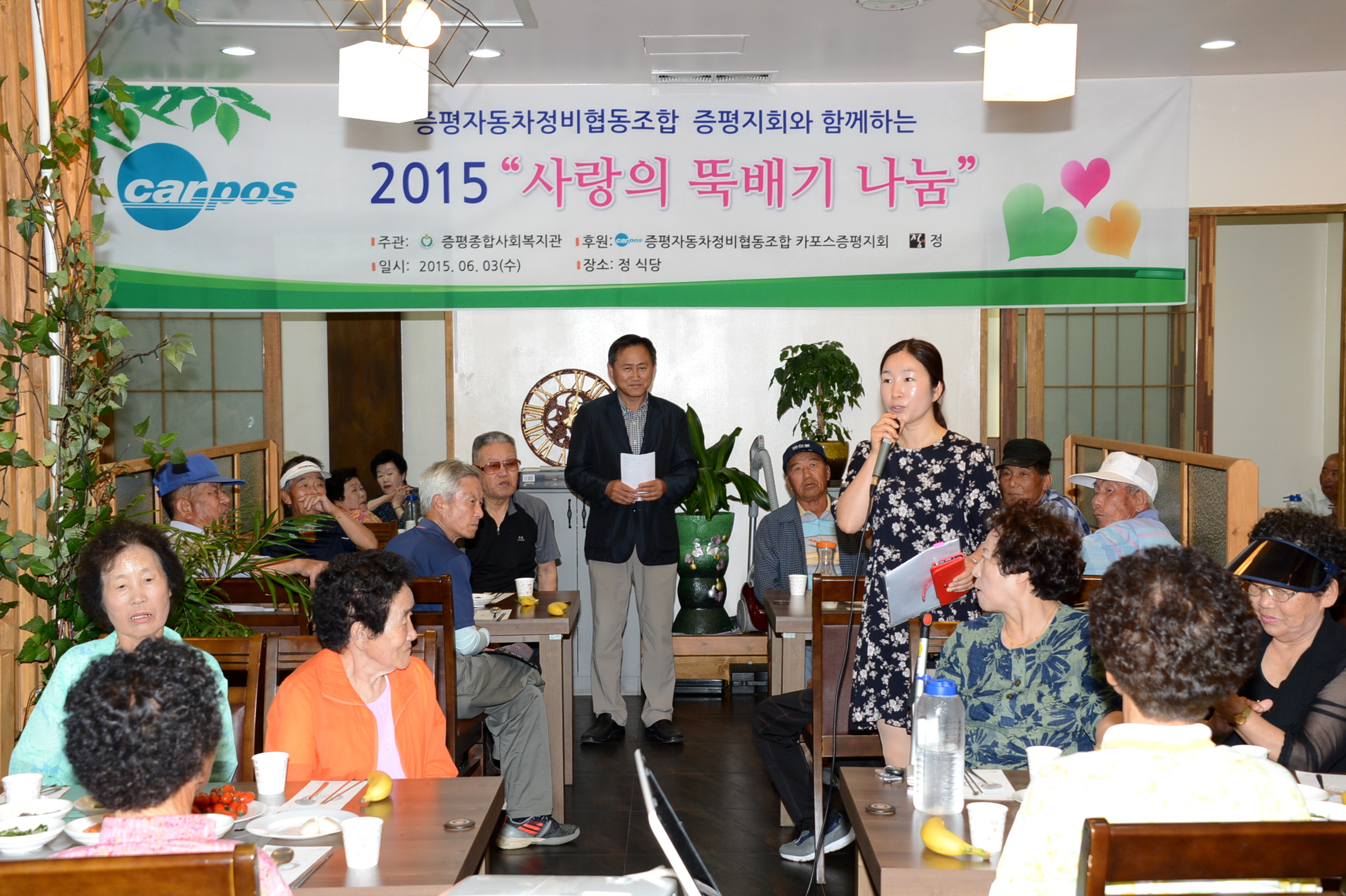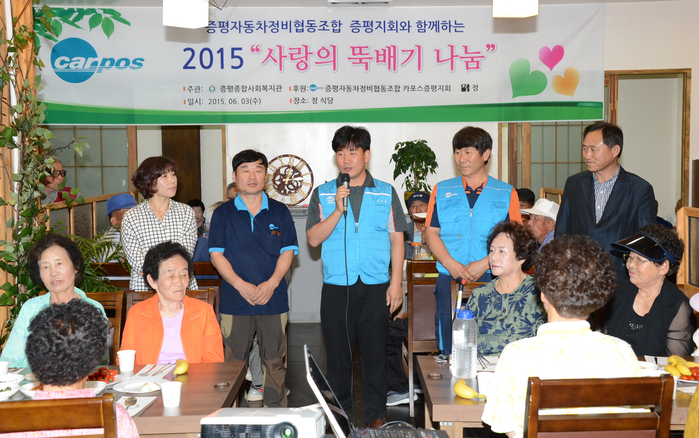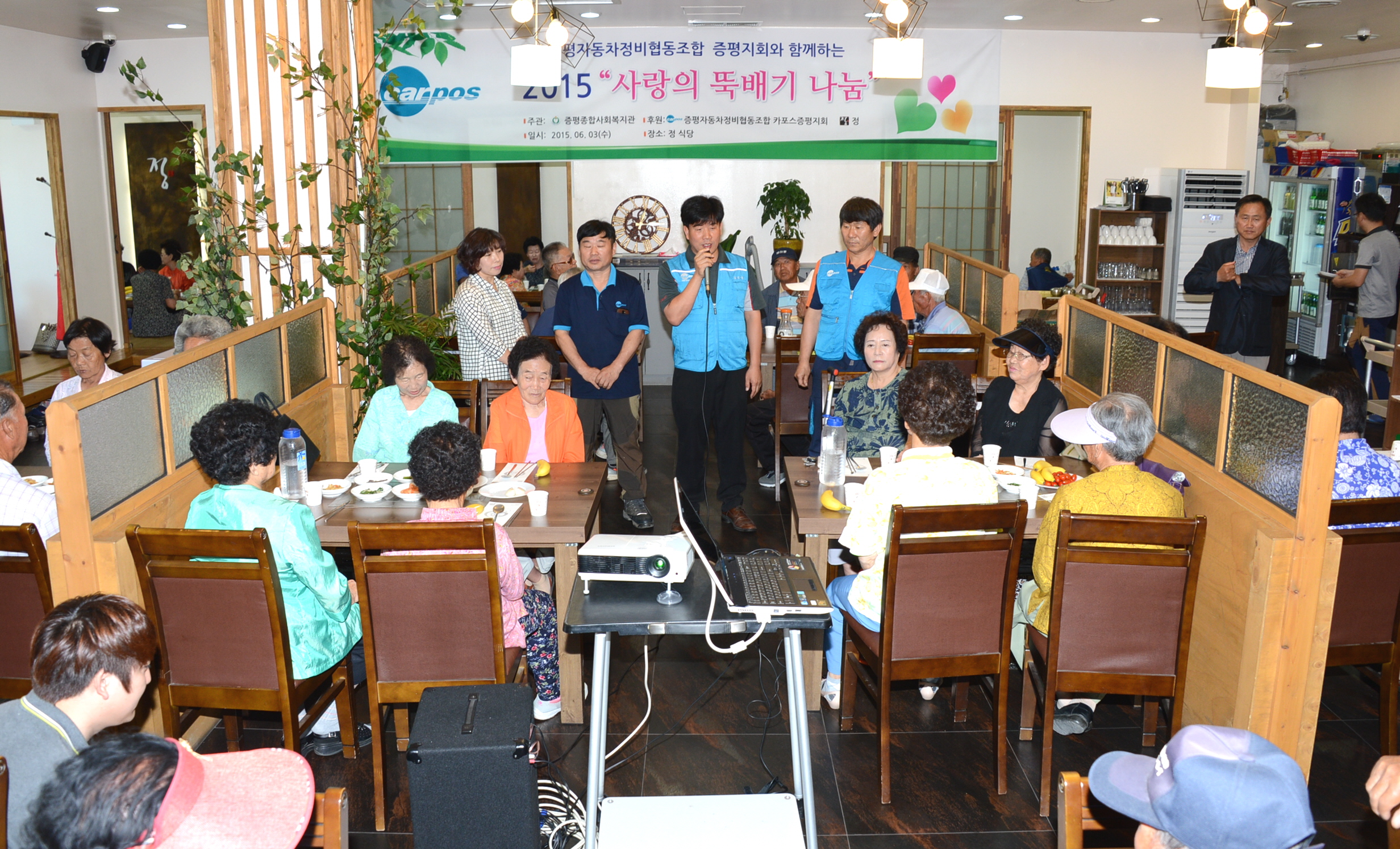 카포스(충북자동차전문정비사업조합) 증평지회와 음식점 "정", 증평종합사회복지관은 3일 오전 11시 증평읍 송산리 정 식당에서 회원 및 봉사자 10여명이 지역의 소외계층 및 독거어르신 100명에게 "사랑의 뚝배기 나눔"봉사를 실시했다.[보도자료실 참조]
