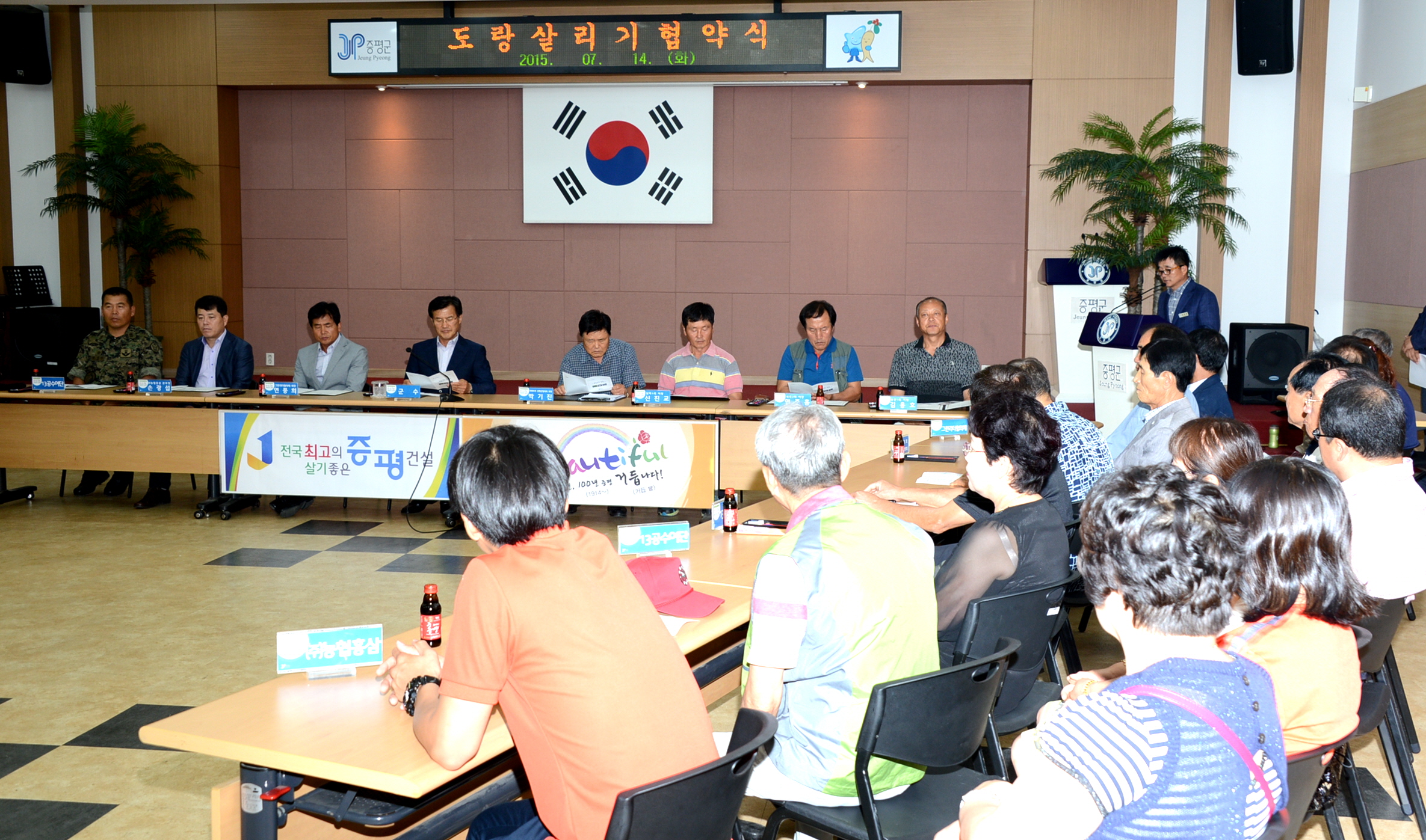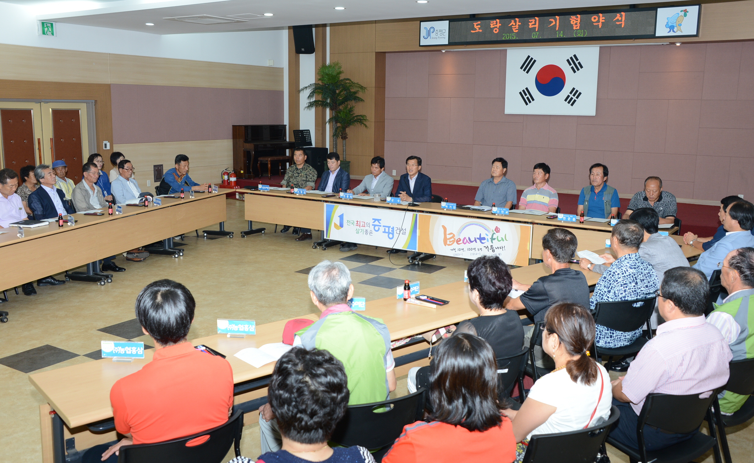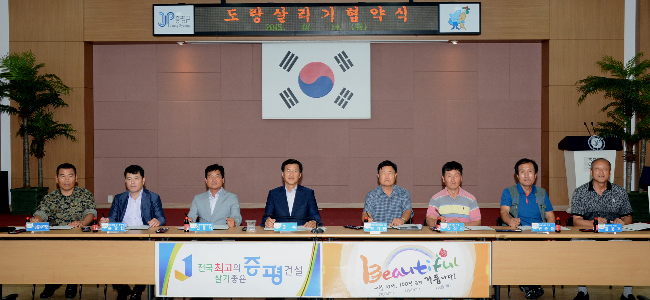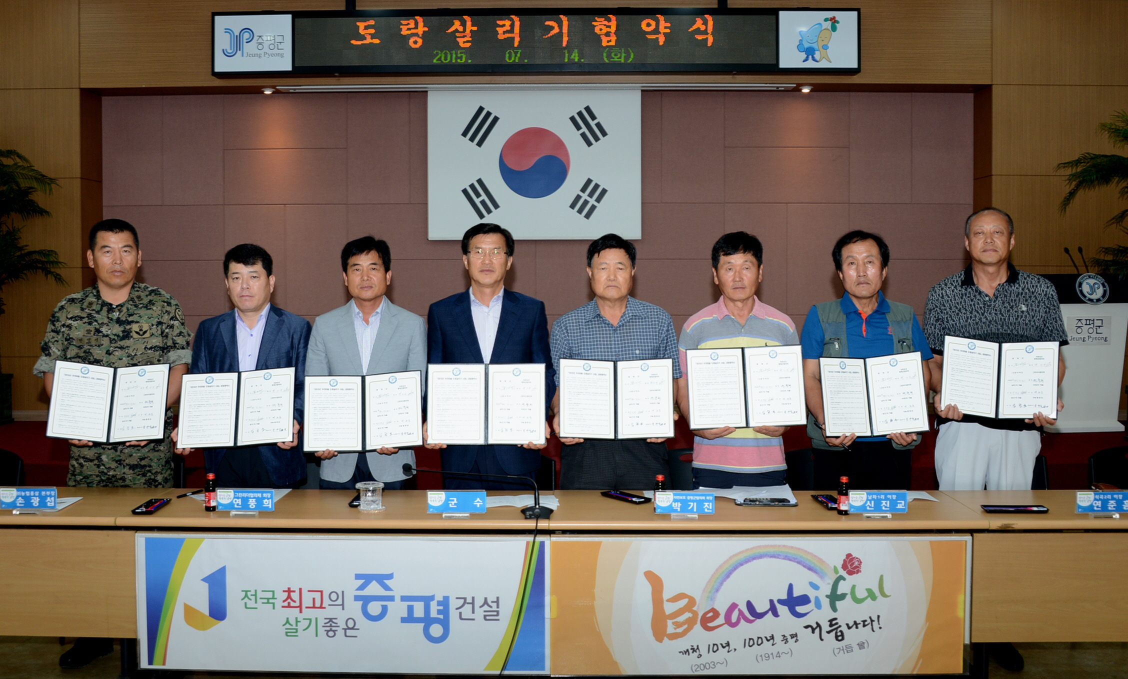 증평군은 14일 오전 10시 군청 대회의실에서 홍성열 증평군수 ,박기진 자연보호 증평군협의회장, 연풍희 그린리더협의체 회장, 허길용 13공수여단 참모장 등 8개 기관․ 사회단체가 참석한 가운데‘2015년 우리마을 도랑살리기 사업 협약식’을 체결했다.(보도자료실 참조)