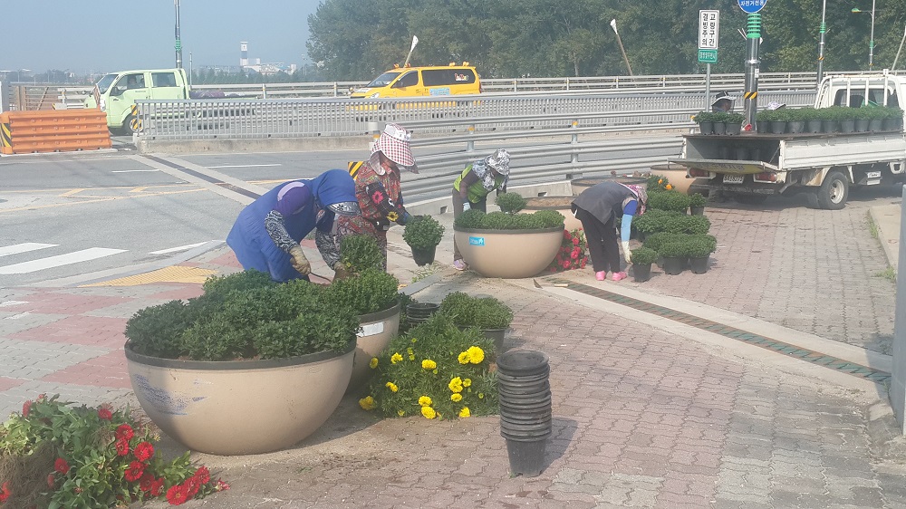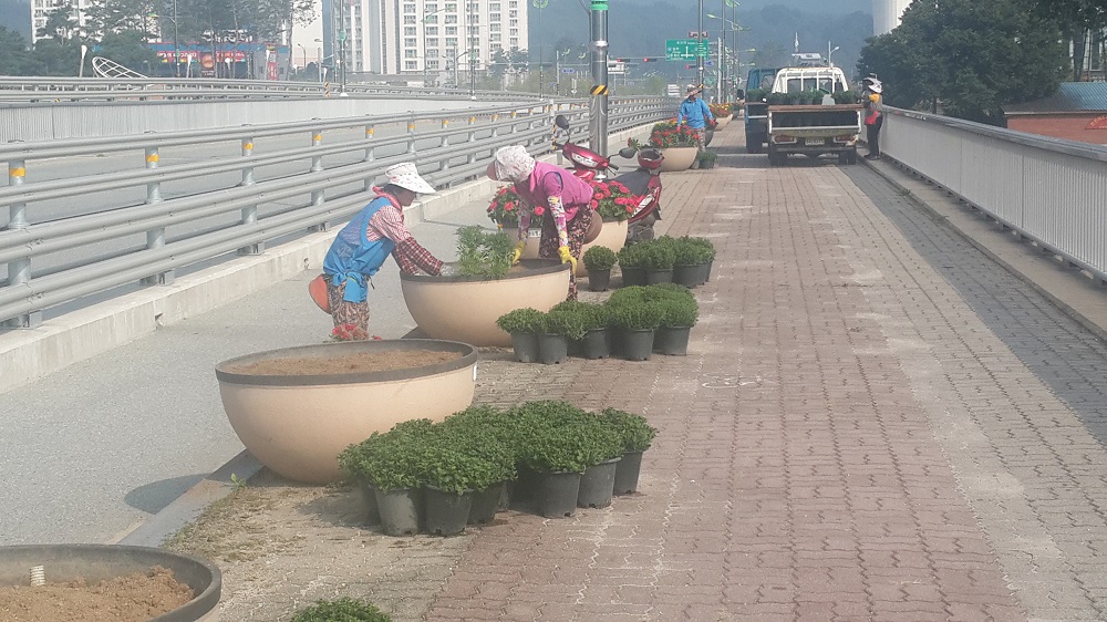 증평군이 가을의 전령 국화로 단장하기 위해 분주히 움직이고 있다.