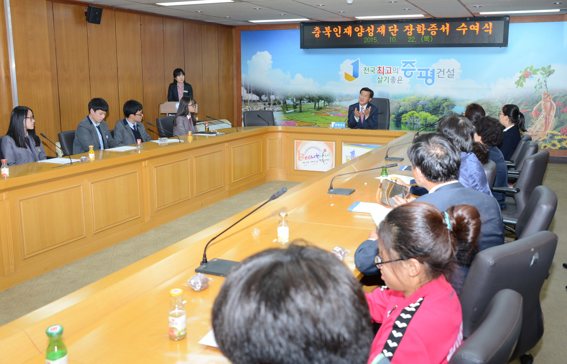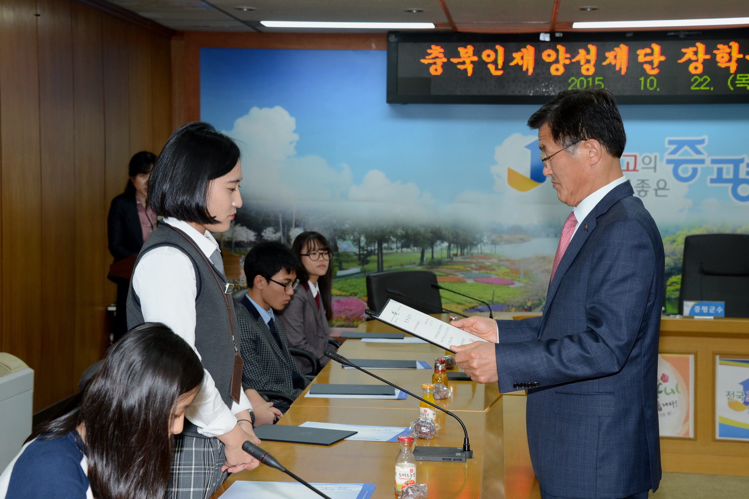 증평군은 22일 오후 5시 30분 군청 소회의실에서 홍성열 군수와 장학생, 가족 등 30여명이 참석한 가운데 2015년 하반기 충북인재양성재단(이사장 이시종 충북도지사)에서 선발한 장학생에 대해 장학증서 수여식을 가졌다.(보도자료실 참조)