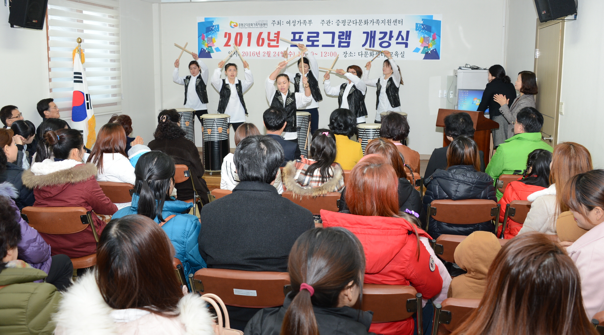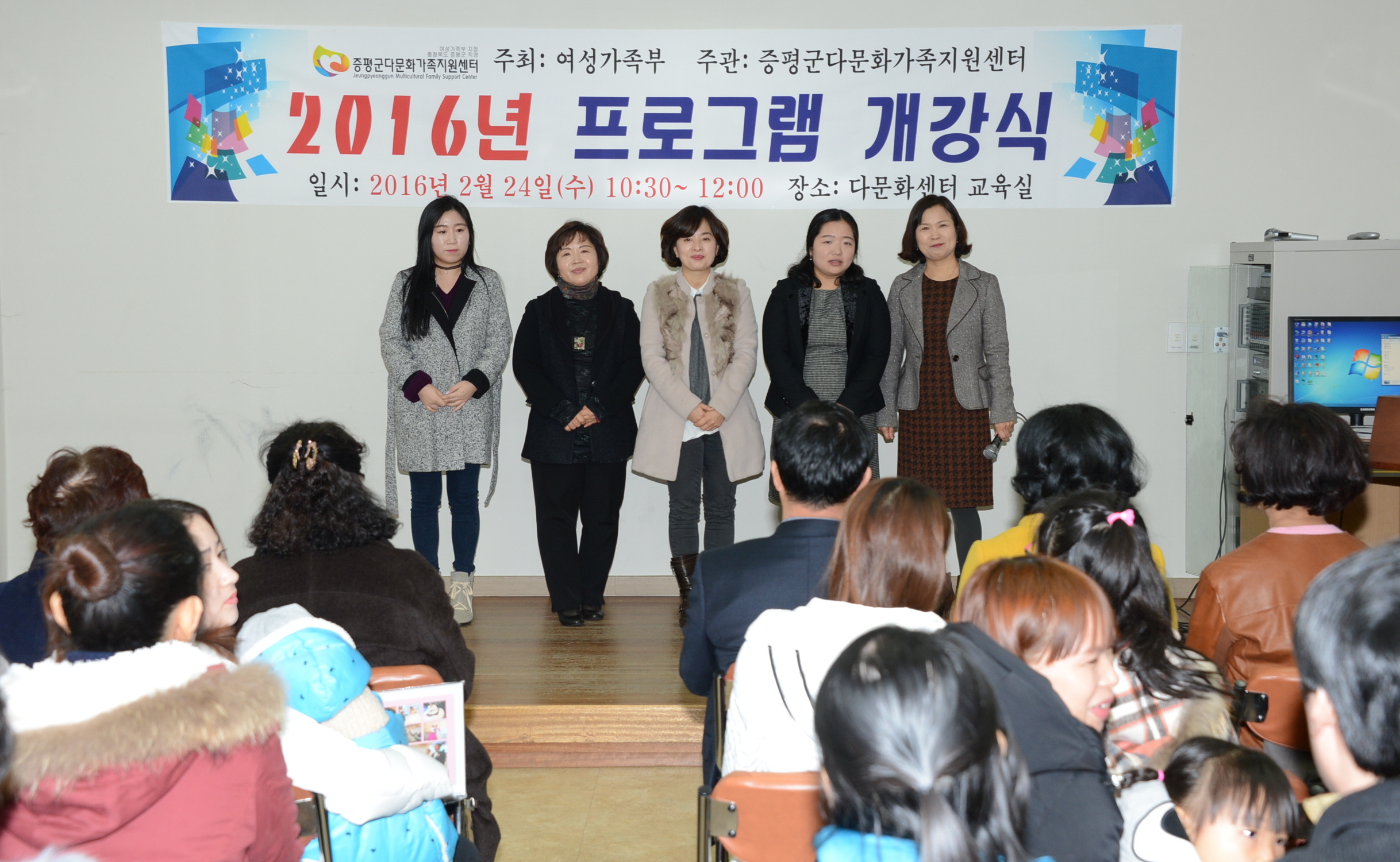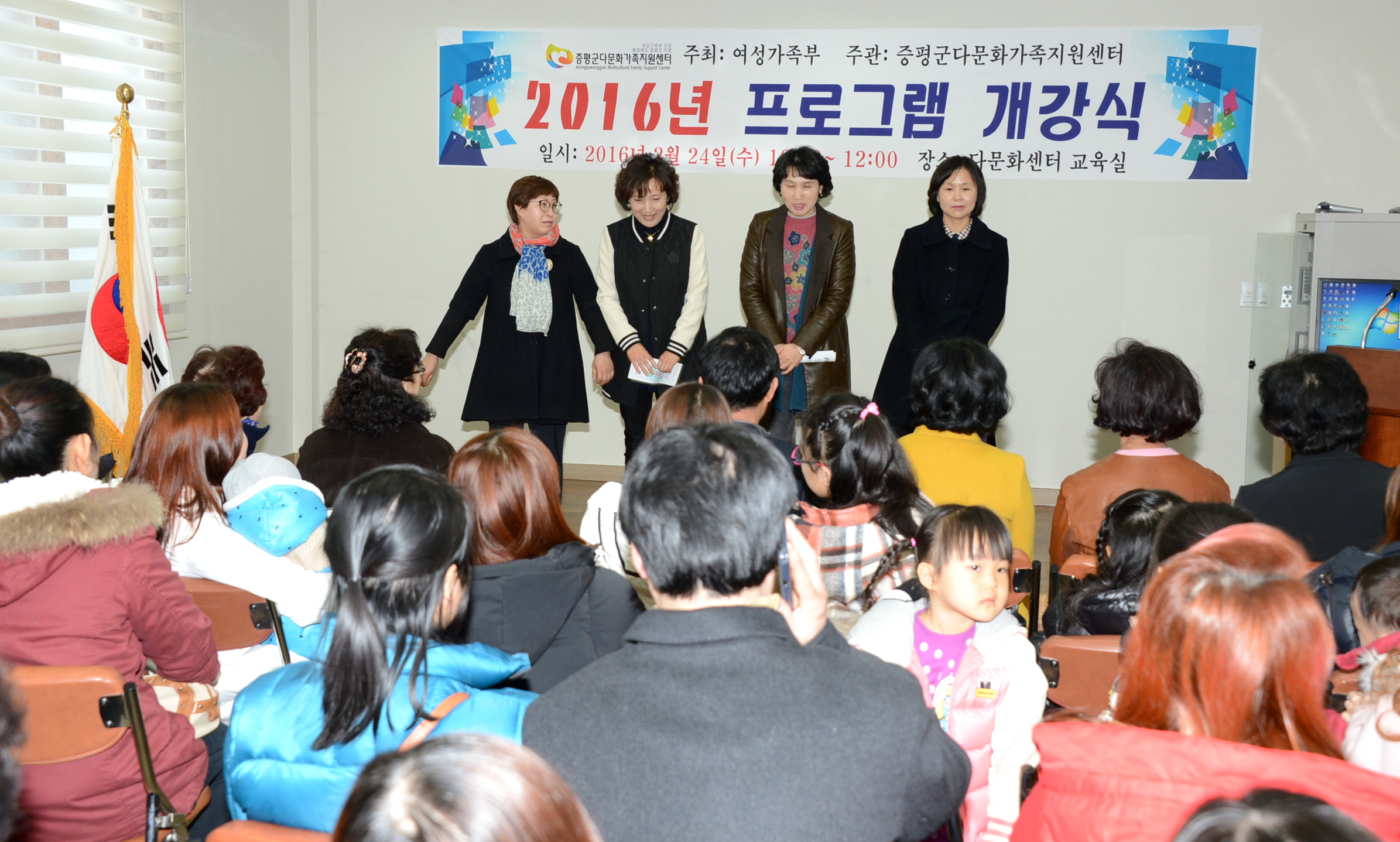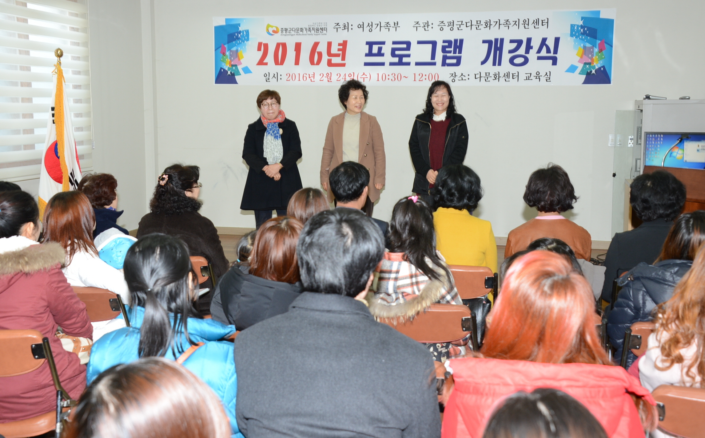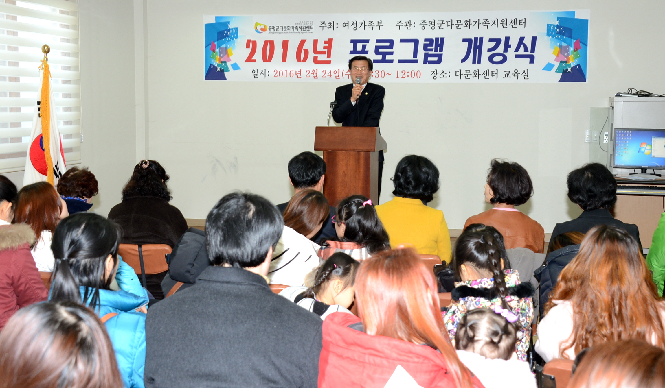 증평군 다문화가족지원센터는 24일 오전 10시 30분 다문화가족지원센터 교육실에서 홍성열 군수를 비롯해 결혼이민여성 등 60여명이 참석한 가운데 2016년도 프로그램 개강식을 가졌다.(보도자료실 참조)
