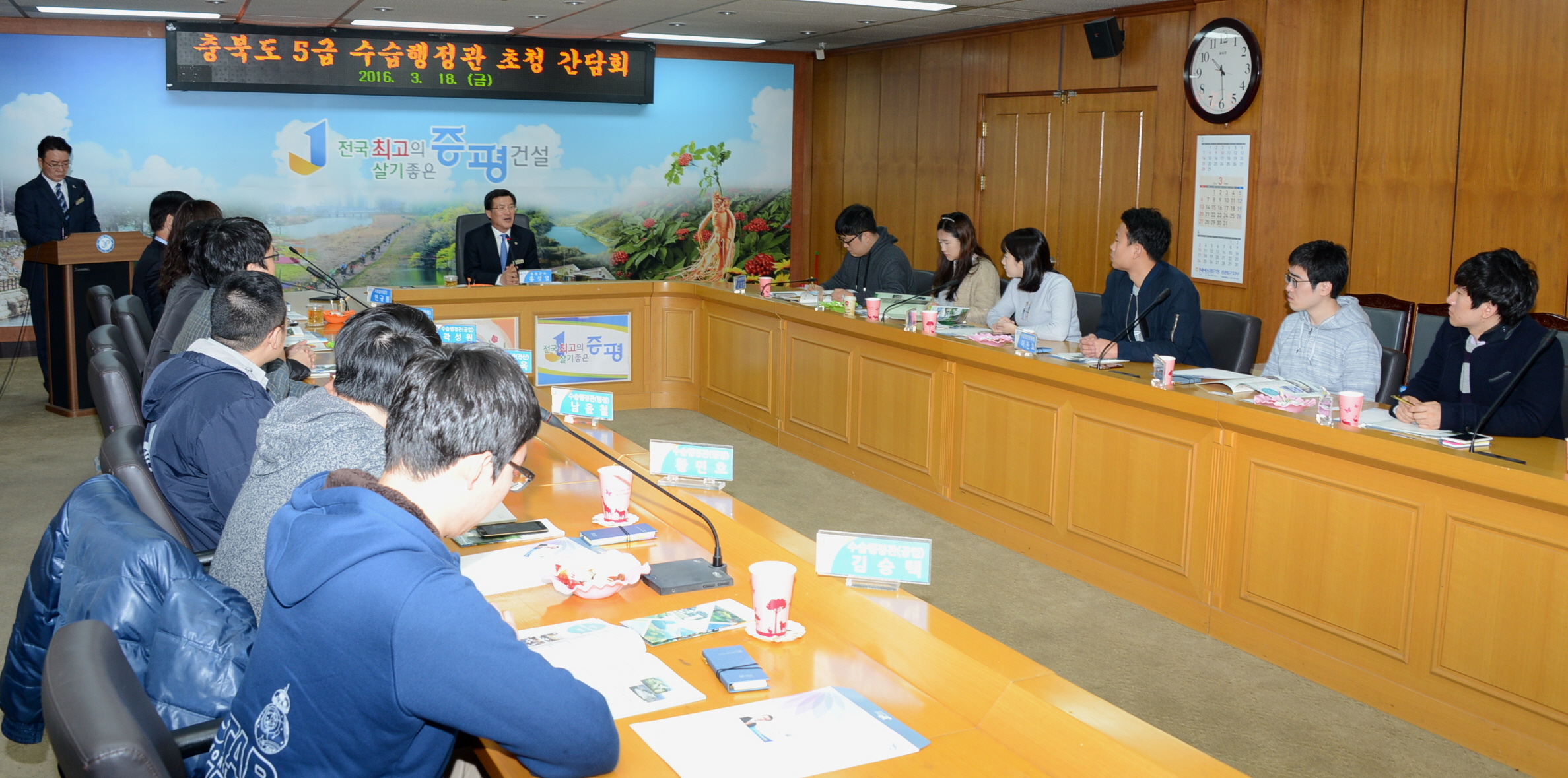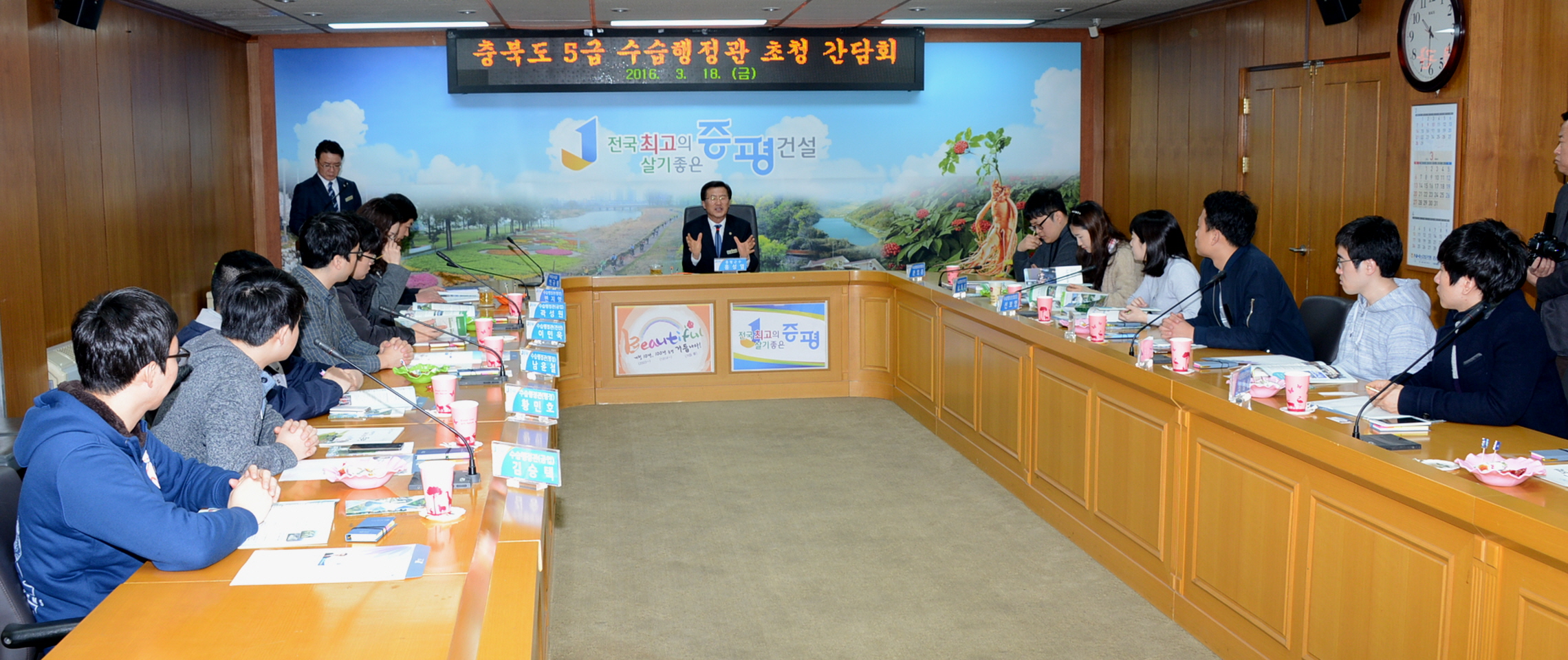 증평군은 18일 충북도에서 수습중인 5급 공채 사무관 12명을 초청해 홍성열 군수와 지역 현안에 대한 간담회를 가졌다.(보도자료실 참조)