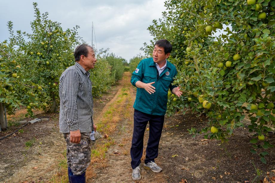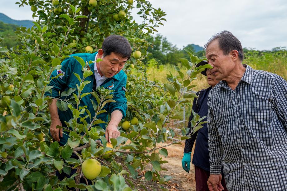 이재영 증평군수가 추석 명절을 앞둔 13일 햇사과를 수확 중인 증평읍 연탄리 사과 재배 농가를 방문했다.