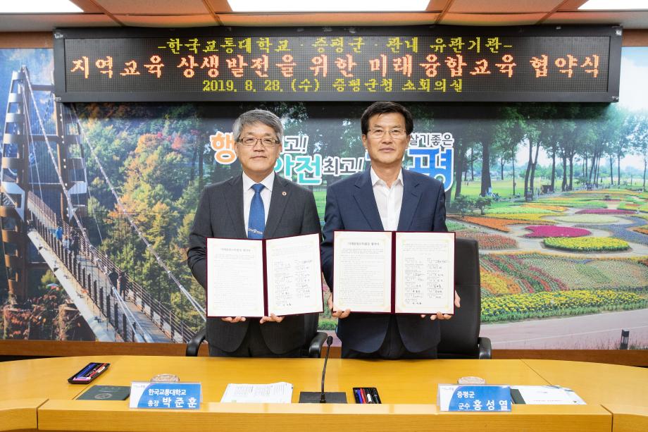 한국교통대학교(총장 박준훈)는 28일 증평군청 소회의실에서 증평군을 비롯한 관내 특성화고 및 사회단체, 복지재단, 증평산업단지 등 13개 유관기관이 참여한 가운데 ‘지역교육 상생을 위한 미래융합교육 협약식’을 개최했다.