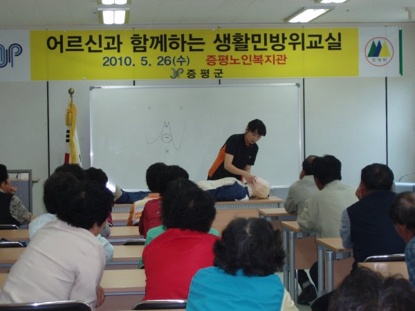 증평군은 27일 노인복지관에서 어르신 70여명을 대상으로 화재 및 각종 안전사고예방을 위한 민방위 교육을 실시했다. [증평포커스 참조]
