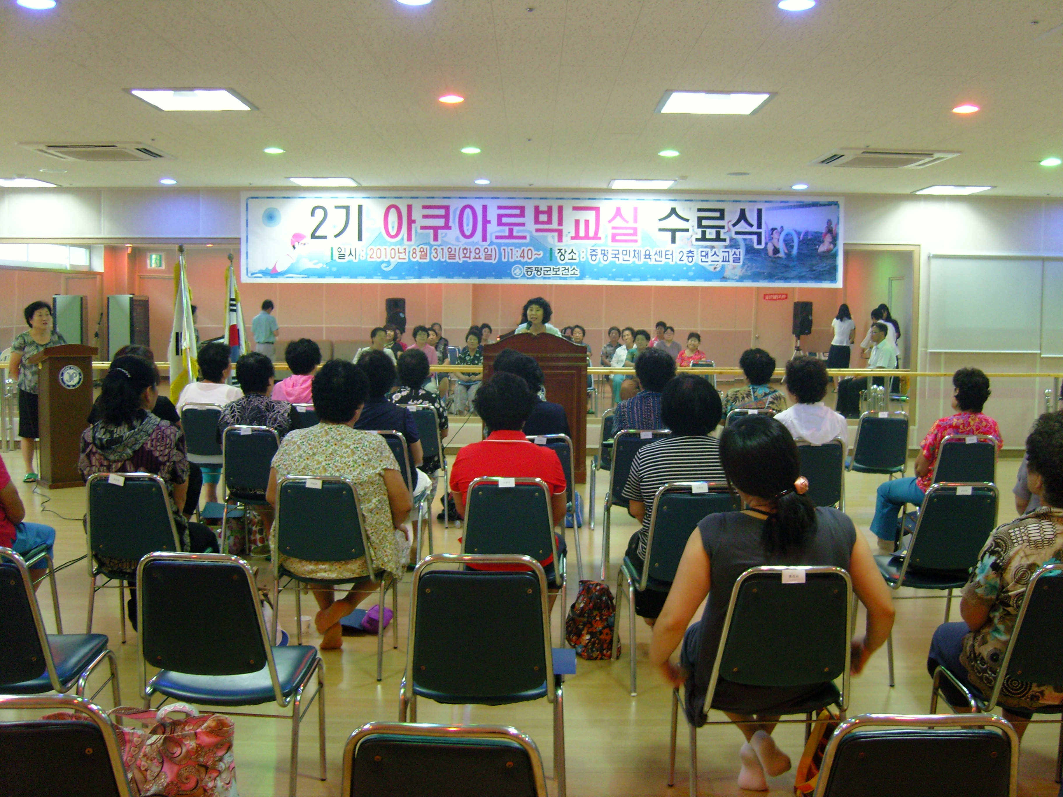 증평군보건소(소장 박혜숙)는 31일 오전 11시 40분 증평국민체육센터 2층 댄스실에서 수강자를 비롯한 프로그램 관계자 등 40여명이 참석한 가운데 2기 아쿠아로빅교실 수료식을 개최했다.[증평포커스 참조]