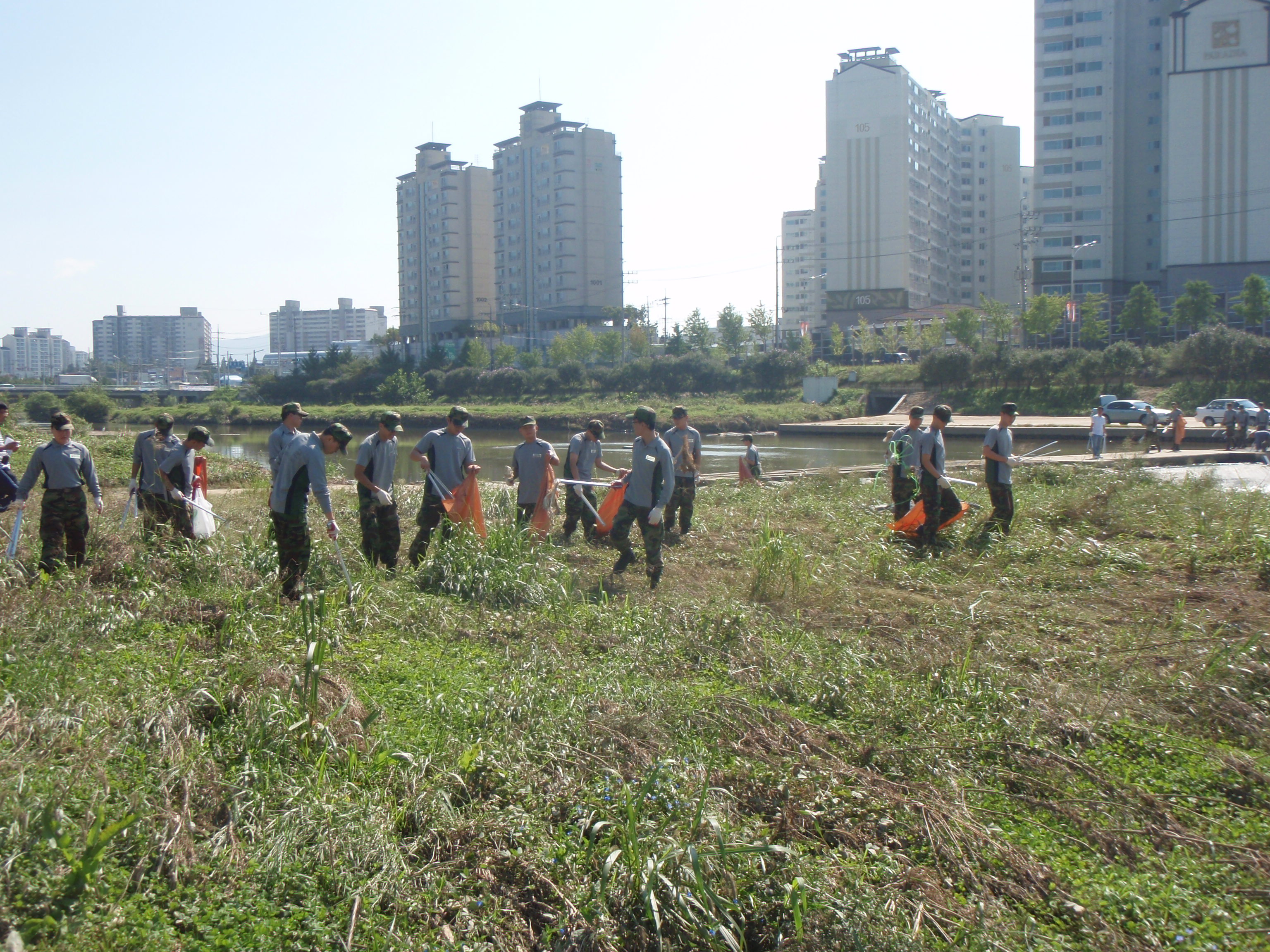 증평군 건설재난과 직원들과 육군 37사단 장병 등 130여명은 16일 오전 10시부터 보강천 반탄대교에서 장미대교에 이르는 구간에 대한 하천정화활동을 펼쳤다. [보도자료실 참조]