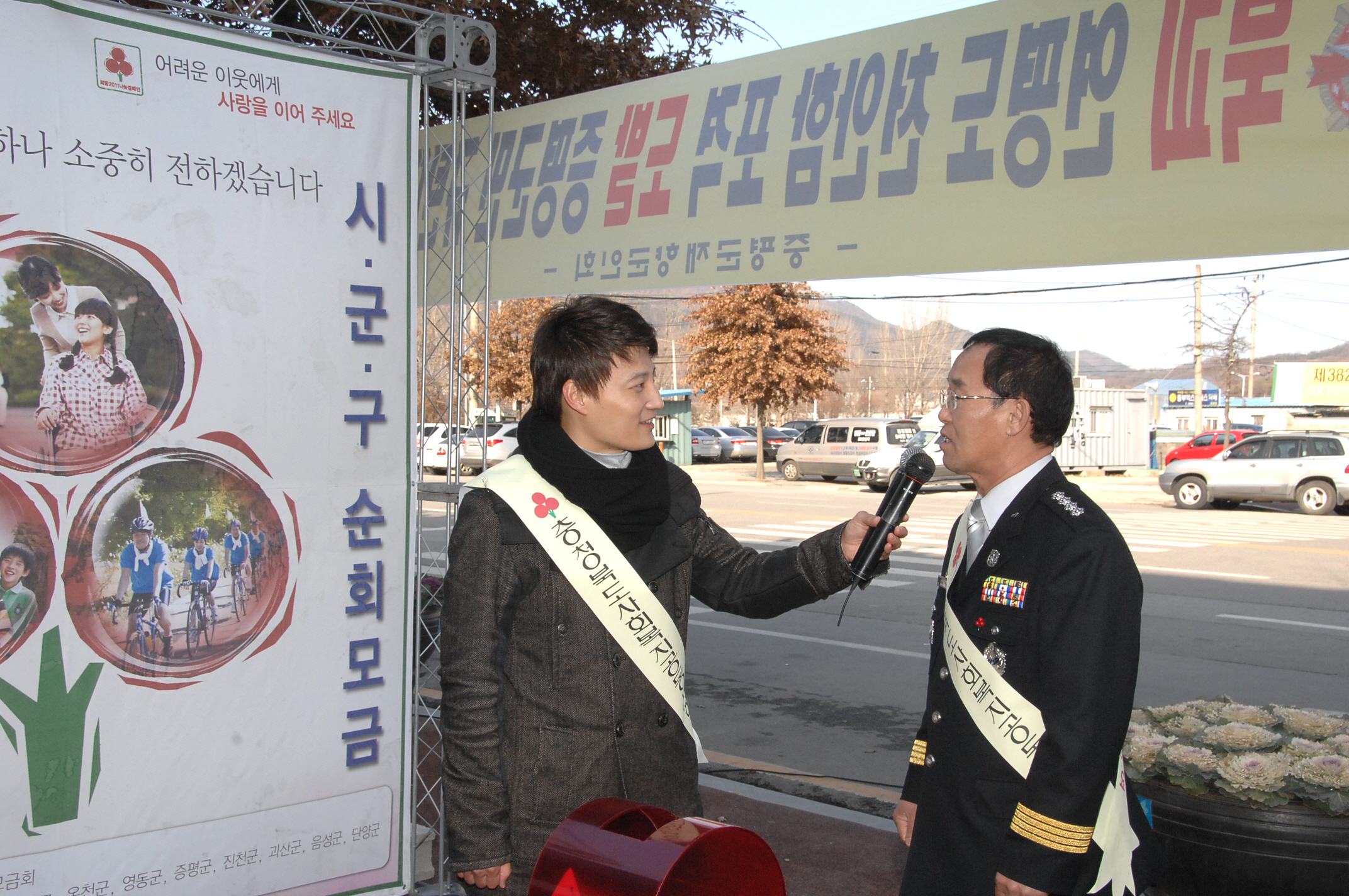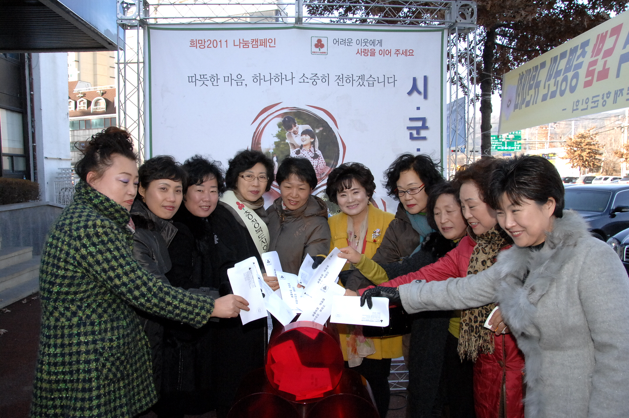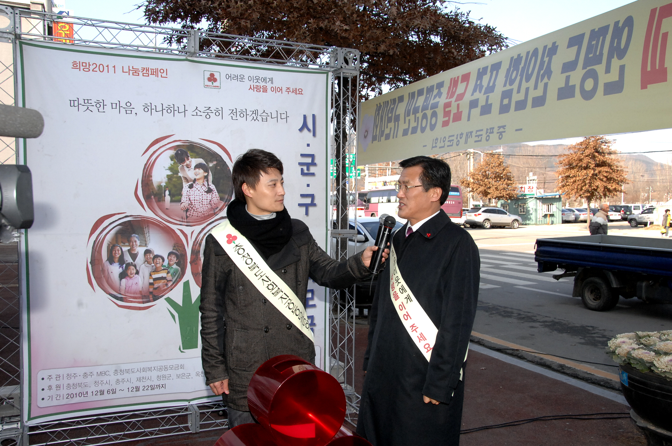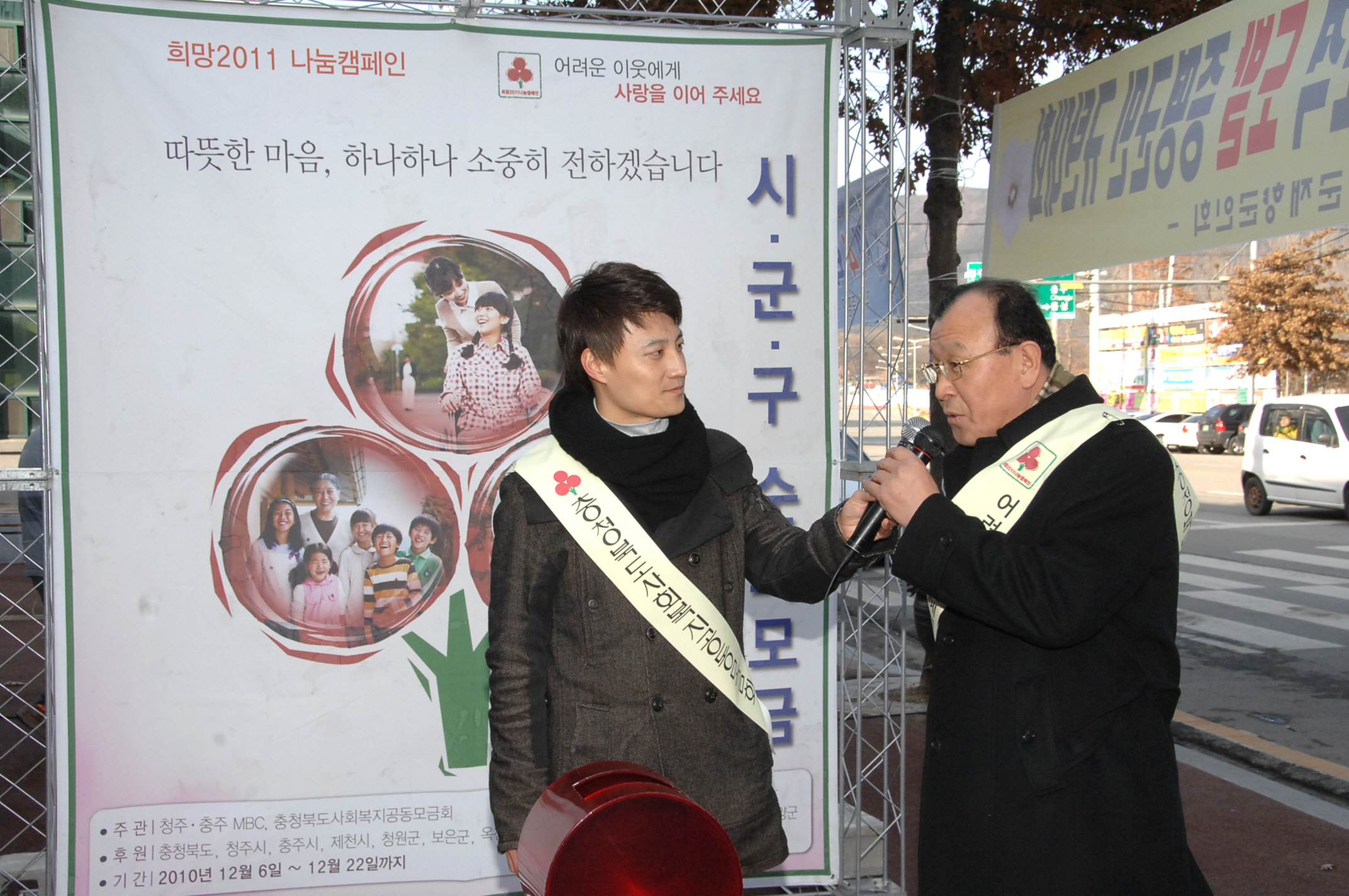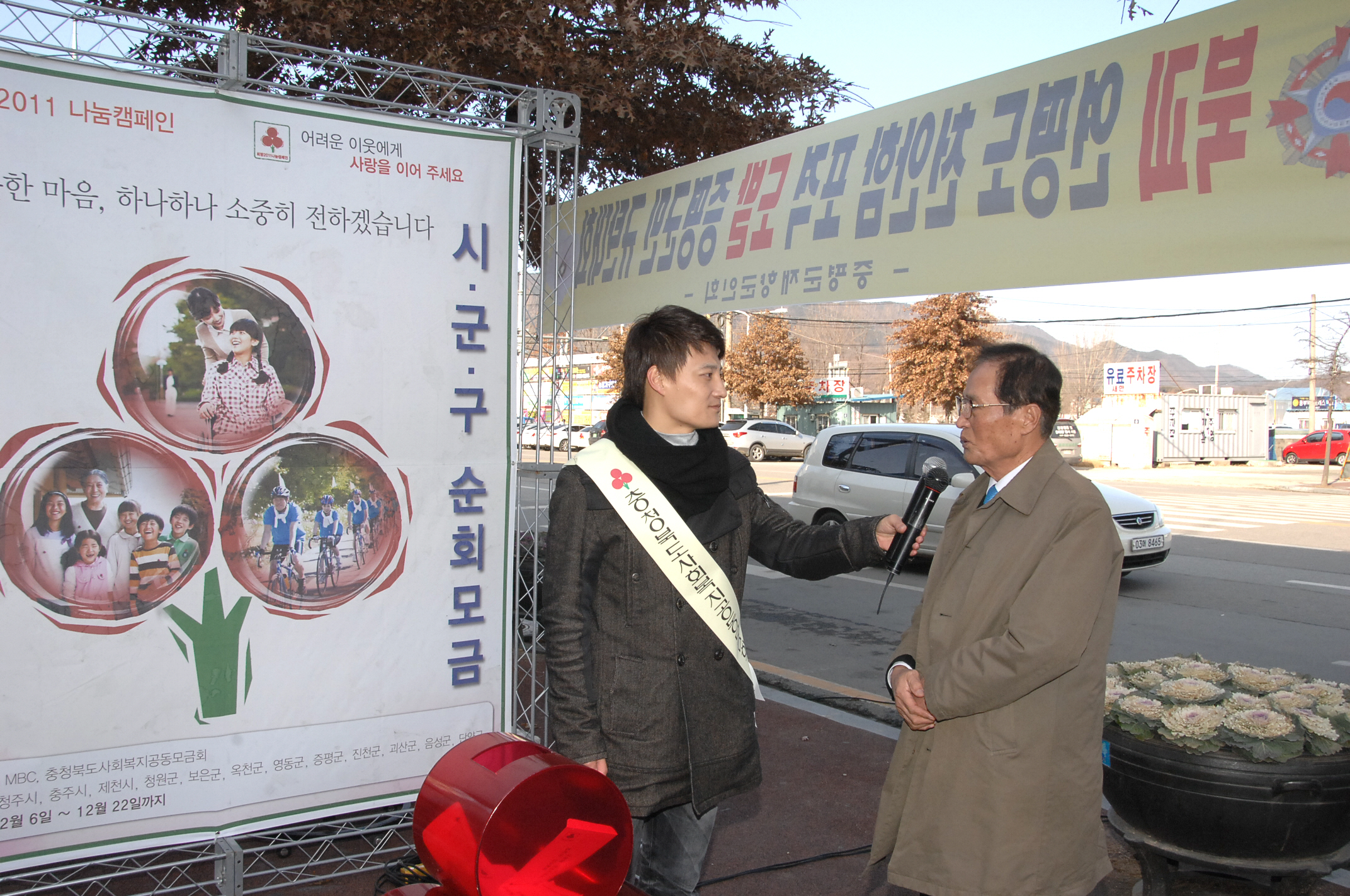 희망 2011 한사랑"증평군 순회 모금이 14일 오후 1시부터 3시까지 군청 민원실앞에서 펼쳐져 현금과 물품 등 6천752만2천원의 성금이 모아진 것으로 알려졌다.