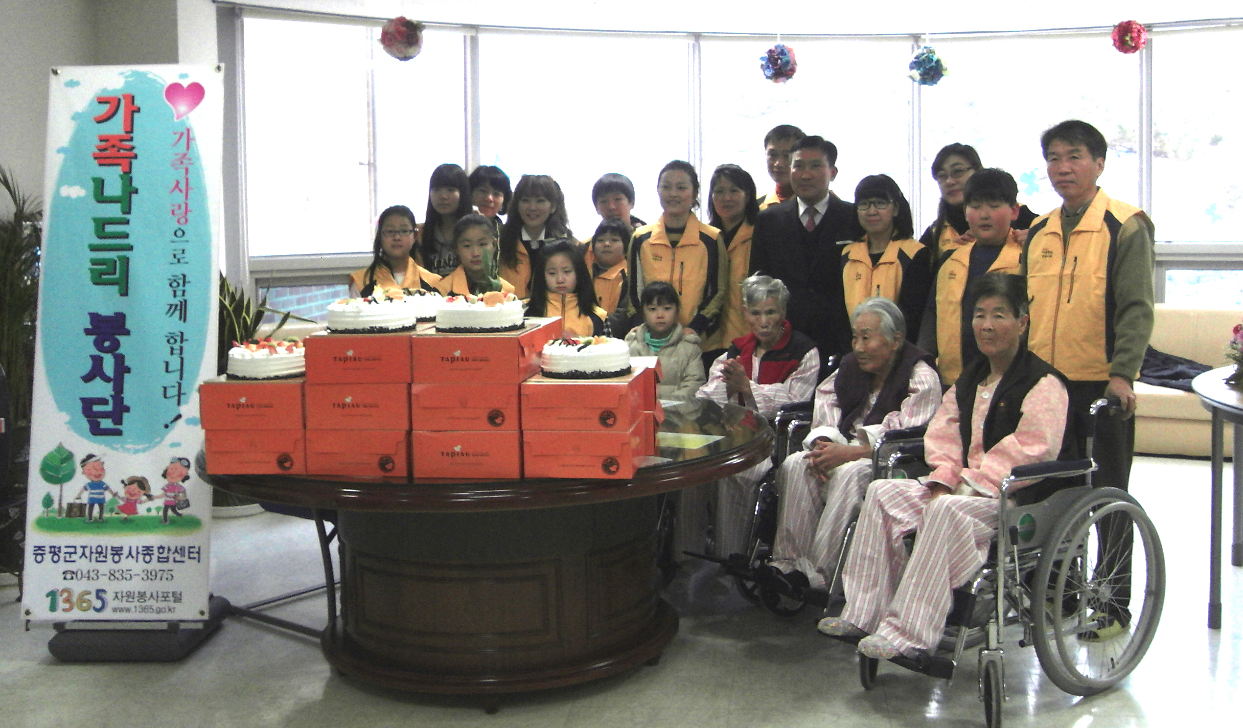 증평 가족나드리봉사단 7가족(27명)은 28일 어르신들과 따뜻한 연말연시를 함께 보내고자 가족의 사랑의 듬뿍 담긴 맛있는 케이크 20개를 만들어 노인전문요양원 어르신들에게 전달했다. [보도자료실 참조]