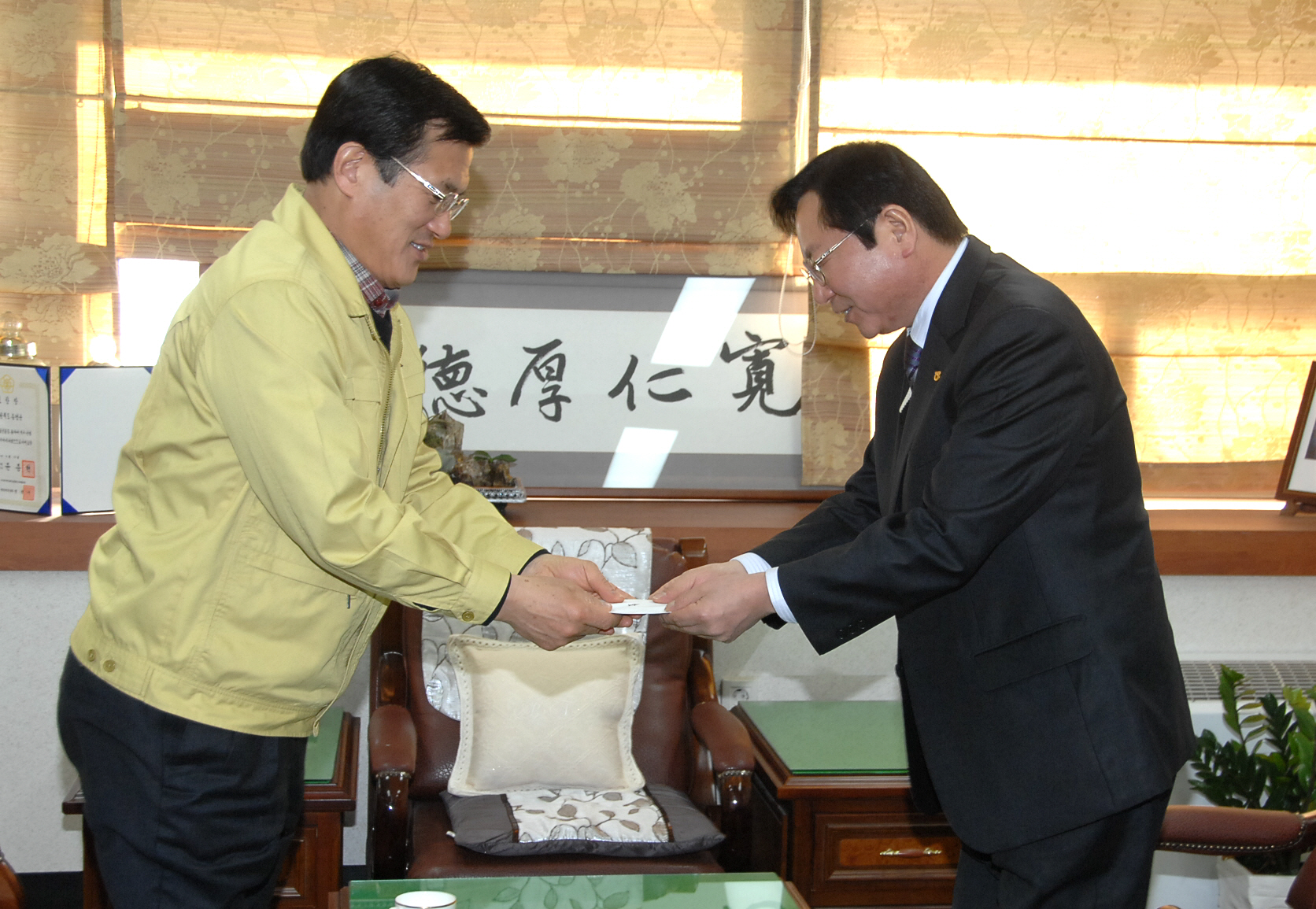 사진은 이종철 농협증평군지부장이 성금 100만원을 홍성열 증평군수에게 전달하는 모습으로 이날 최만수 충북인삼조합장, 이규정 증평농협조합장이 자리를 함께했다.[보도자료실 참조]