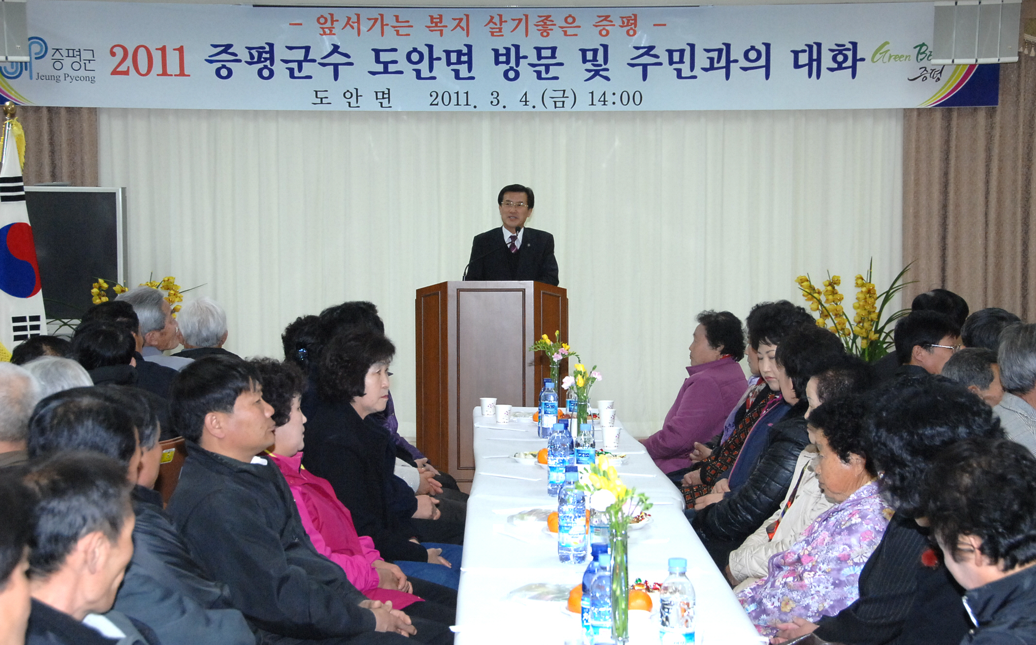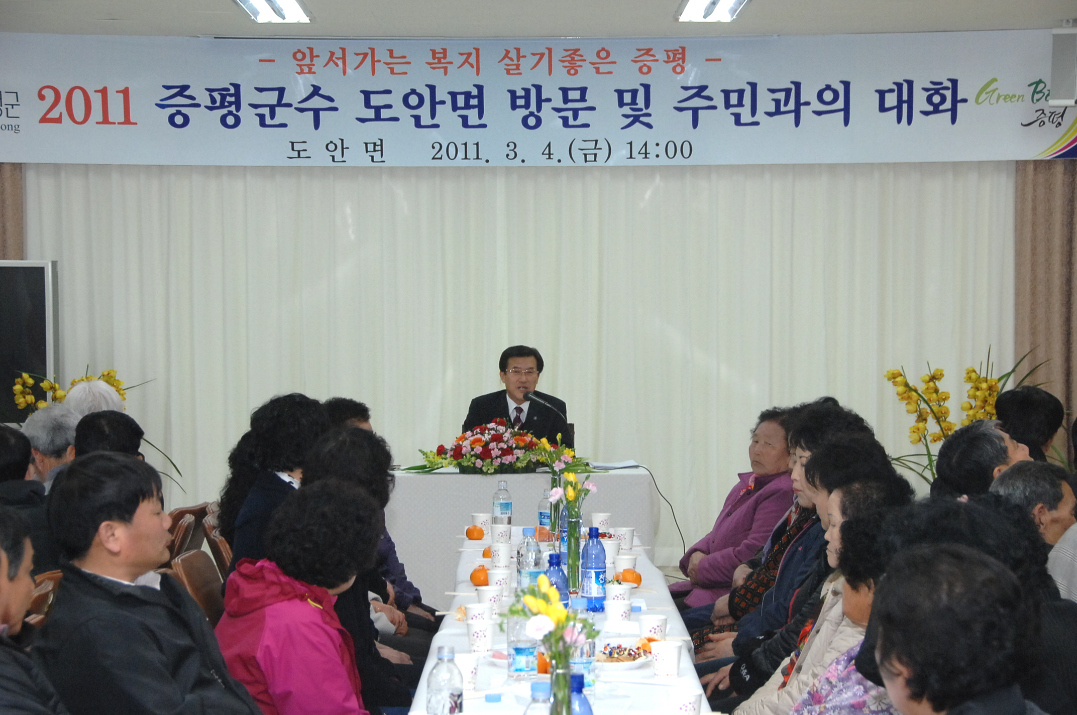 홍성열 증평군수는 2011년 새해 주요 군정일정이 시작되는 3월을 맞아 지난 3일과 4일 양일간 증평읍과 도안면을 방문해 금년도 주요 사업을 설명하고 주민과의 대화시간을 갖는 등 읍·면 순방 일정을 순조롭게 마무리했다.[보도자료실 참조]