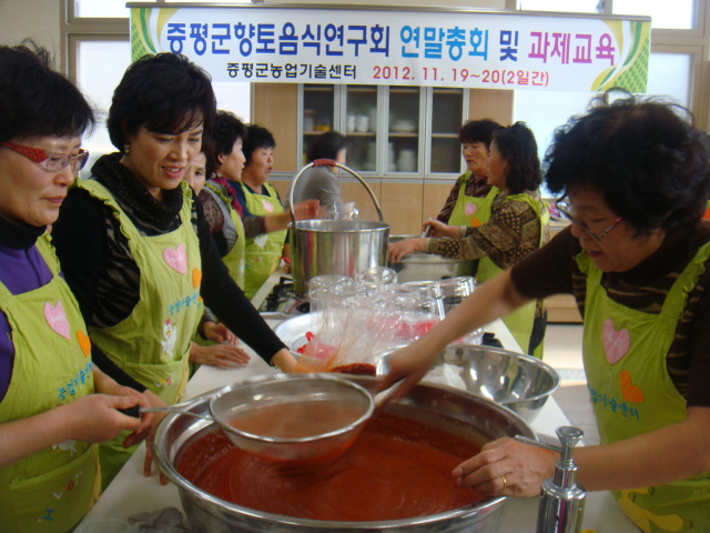 증평군농업기술센터(소장:김동구)는 지난 19일부터 20일까지 2일간 향토음식연구회원(회장:송영희) 45명을 대상으로 전통 찹쌀고추장 만들기 이론 및 실습교육을 실시하고 실습을 통해 만든 고추장을 독거노인 등 취약계층에 전달했다. [보도자료실 참조]