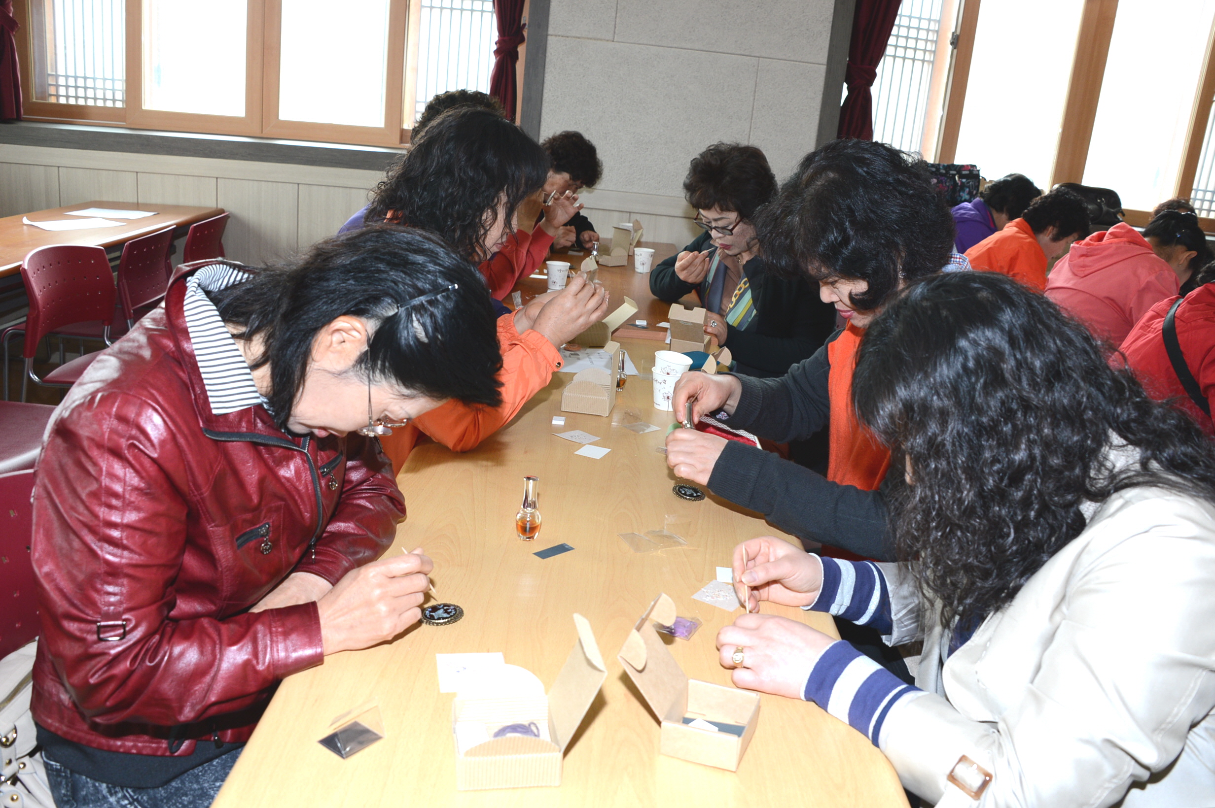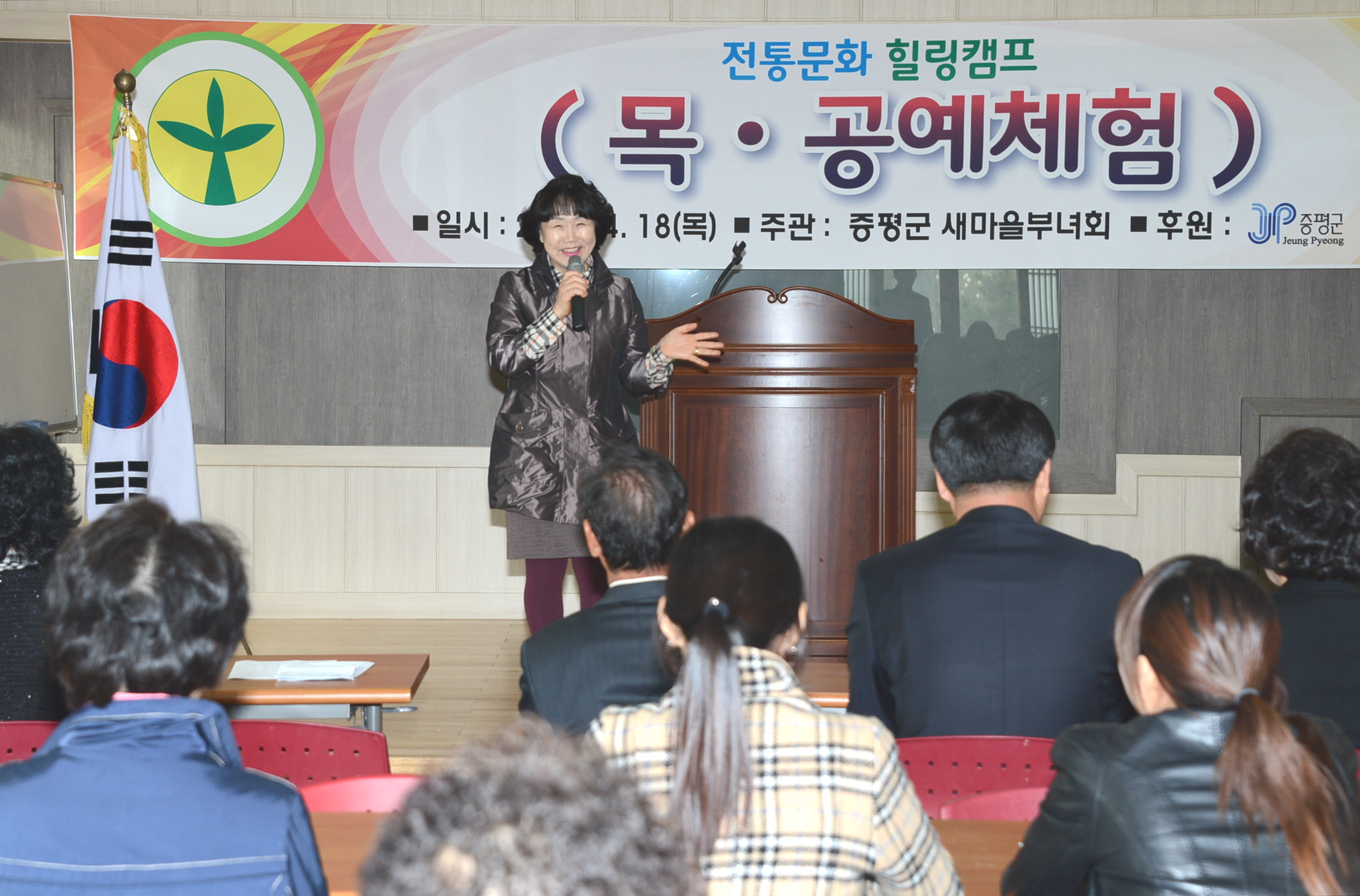 증평군새마을부녀회(김묘현 회장)에서 주관하는 고품격 전통문화 힐링캠프 개강식이 18일 오전 11시분 증평 민속박물관 목공예 체험관에서 캠프참가자 40여명이 참석한 가운데 열렸다. [보도자료실 참조]