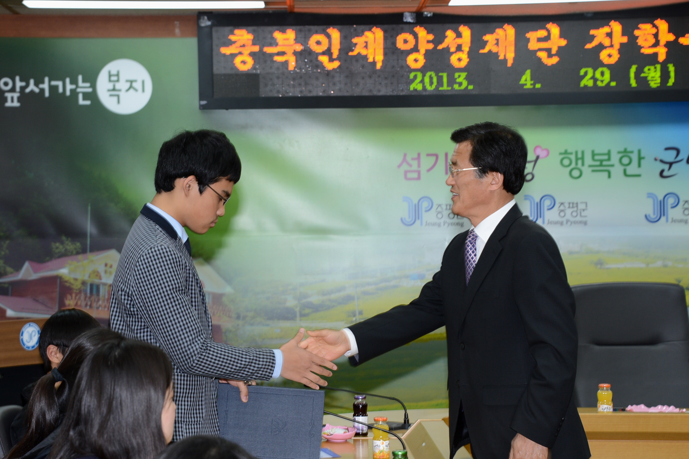증평군은 29일 오후5시 군청 소회의실에서 홍성열 증평군수와 장학생, 가족 등 40여명이 참석한 가운데 2013년 상반기 충북인재양성재단 장학생 장학증서 수여식을 가졌다. [보도자료실 참조]