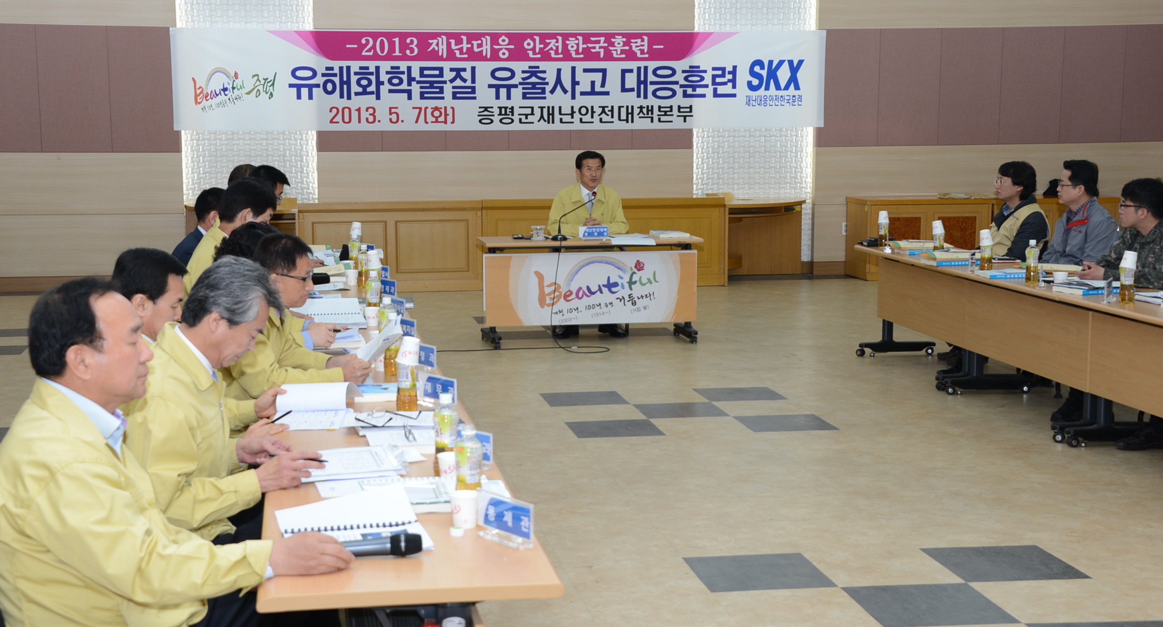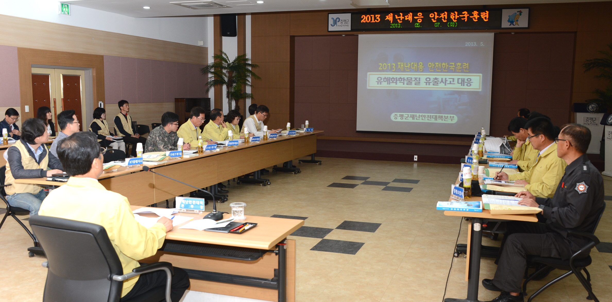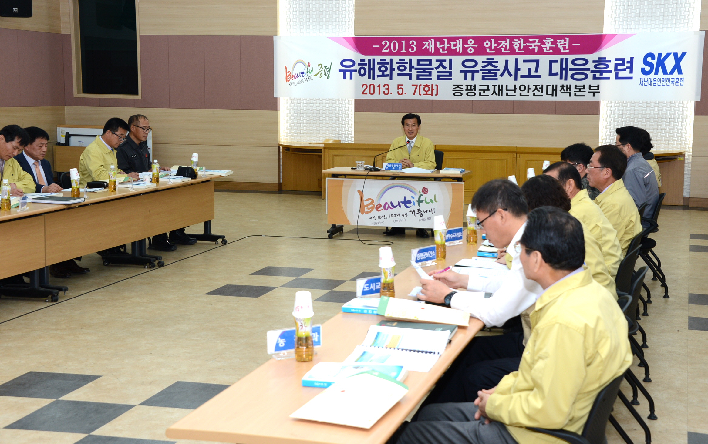 증평군은 7일 10시 군청 대회의실에서 홍성열 증평군수를 비롯해 재난대응 부서장 및 유관기관 관계자 20여명이 참석한 가운데 ‘유해화학물질 유출대응 훈련’을 실시했다. [보도자료실 참조]