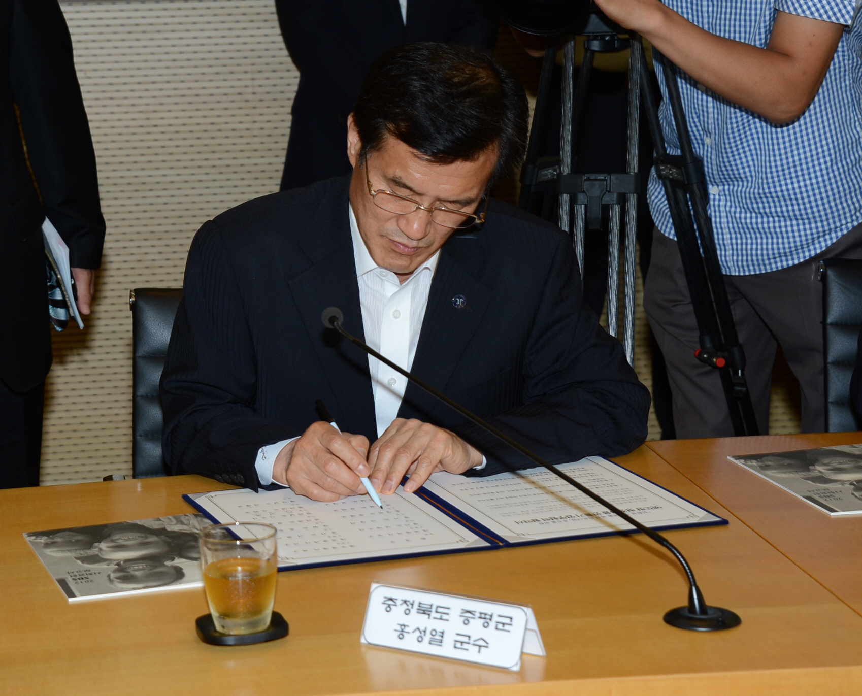 증평군은 5일 서울SBS 목동사옥에서 윤성규 환경부장관(사진 왼쪽), 우원길 SBS사장(사진 오른쪽)이 참석한 가운데 ‘옛도랑 살리기 사업’의 성공적인 추진을 위한 협약을 체결했다[보도자료실 참조]