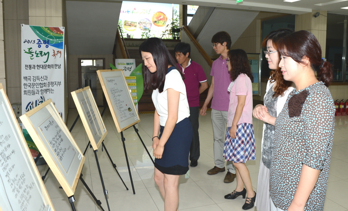 증평군은 한국문인협회 증평지부와 공동으로 군민이 많이 찾는 장소에 2013 증평들노래축제에 전시했던 시화 30여 작품을 올해 연말까지 순회 전시한다. 사진은 군청현관에 전시한 시화를 관람하는 모습이다.[보도자료실 참조]