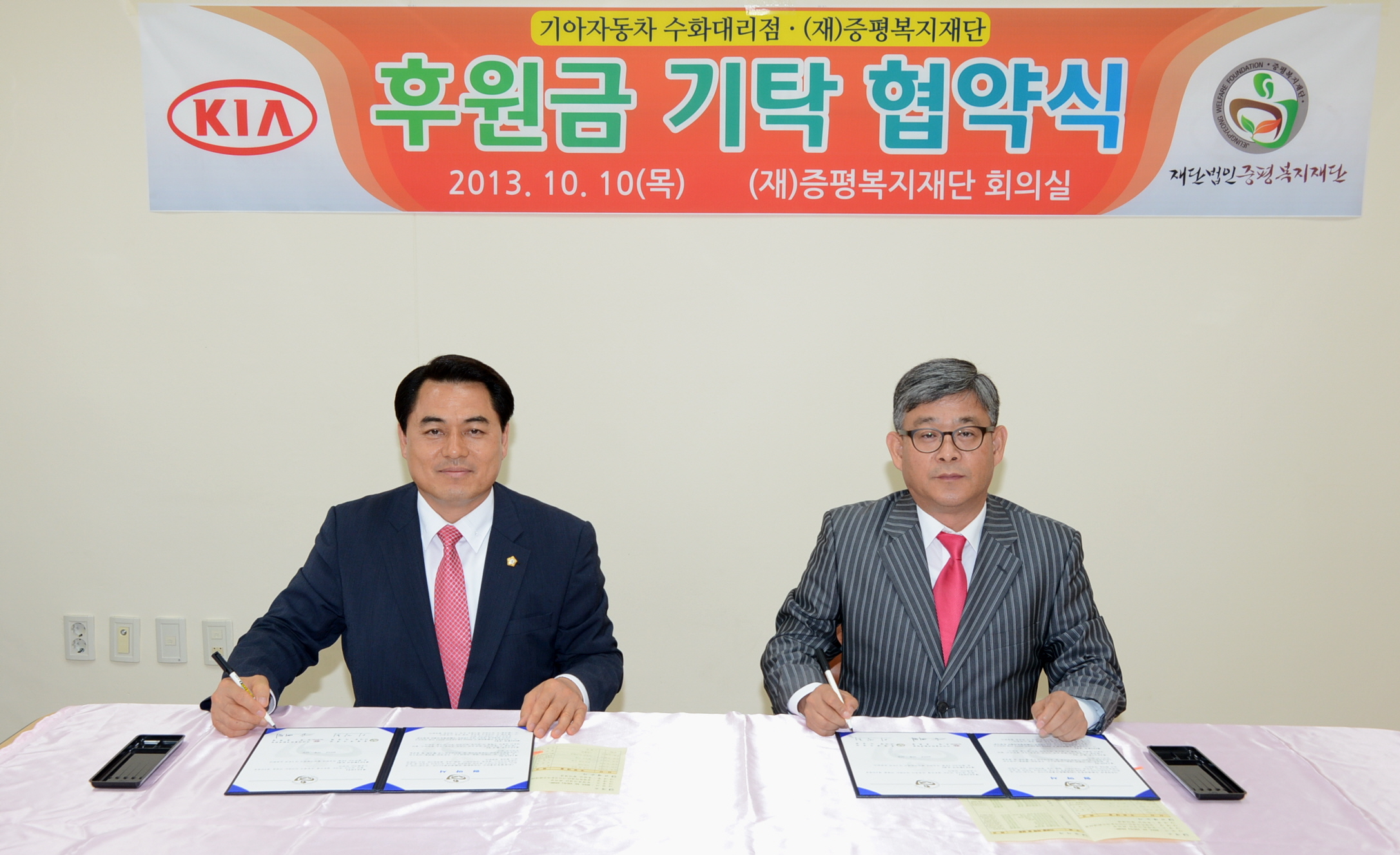 (재)증평복지재단(이사장 이장희)과 기아자동차 수화대리점(소장 윤해명)이 지역복지서비스 발전과 지역의 질 높은 사회복지서비스를 위한 후원금 기탁 협약식을 11일 체결했다. [보도자료실 참조]