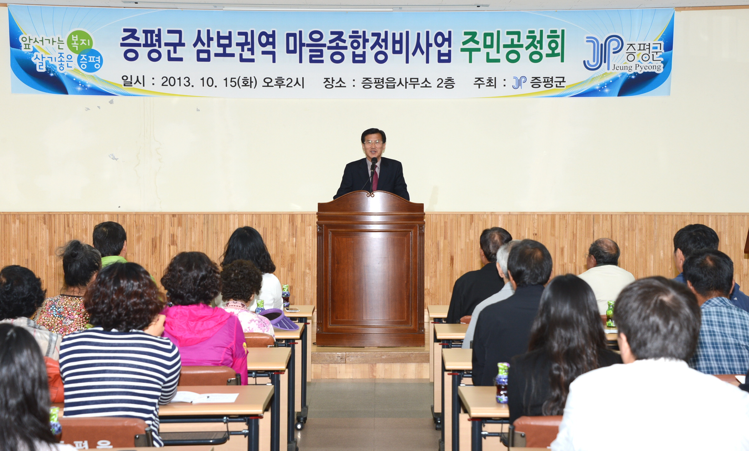 증평군은 15일 오후2시 증평읍사무소 2층 회의실에서 사업대상지관계자와 지역주민 등 100여명이 참석한 가운데 삼보권역 마을종합정비사업 기본계획 수립을 위한 주민공청회를 개최했다. [보도자료실 참조]