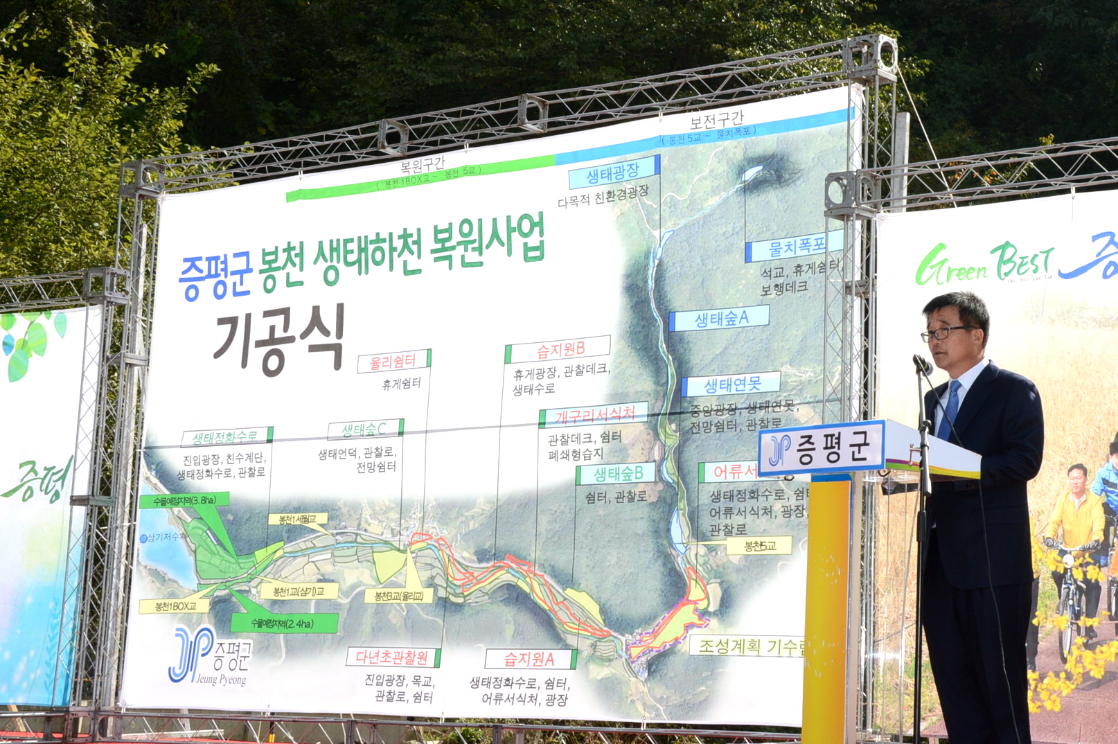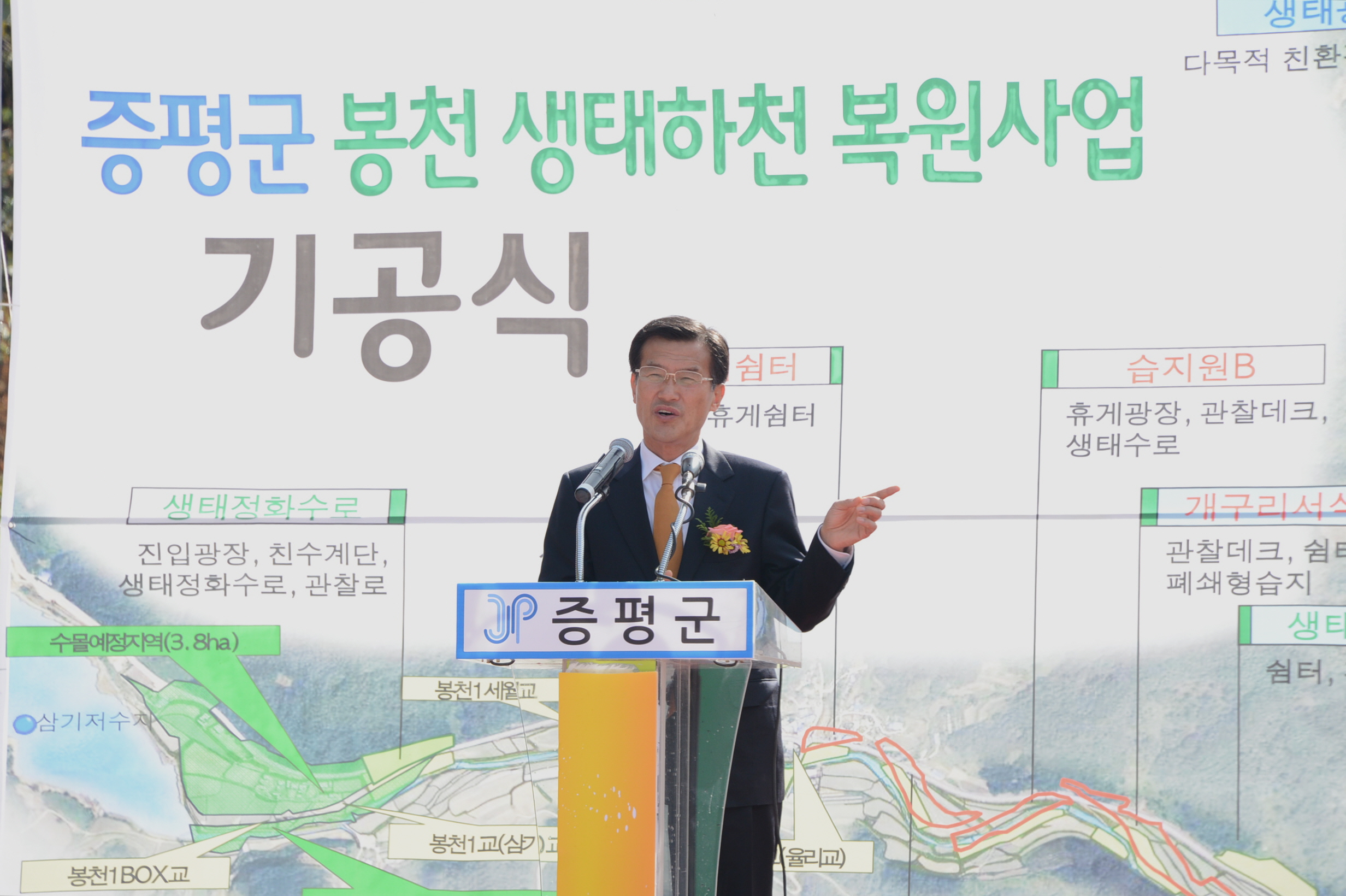 증평군은 17일 오전 10시 증평읍 율리 337번지에서 홍성열 증평군수를 비롯해 증평군의회 박석규 의장과 군의원 및 각 기관단체장, 감리사대표, 시공사대표, 지역주민 등 150여명이 참석한 가운데 ‘봉천 생태하천 복원사업 기공식’을 가졌다. [보도자료실 참조]