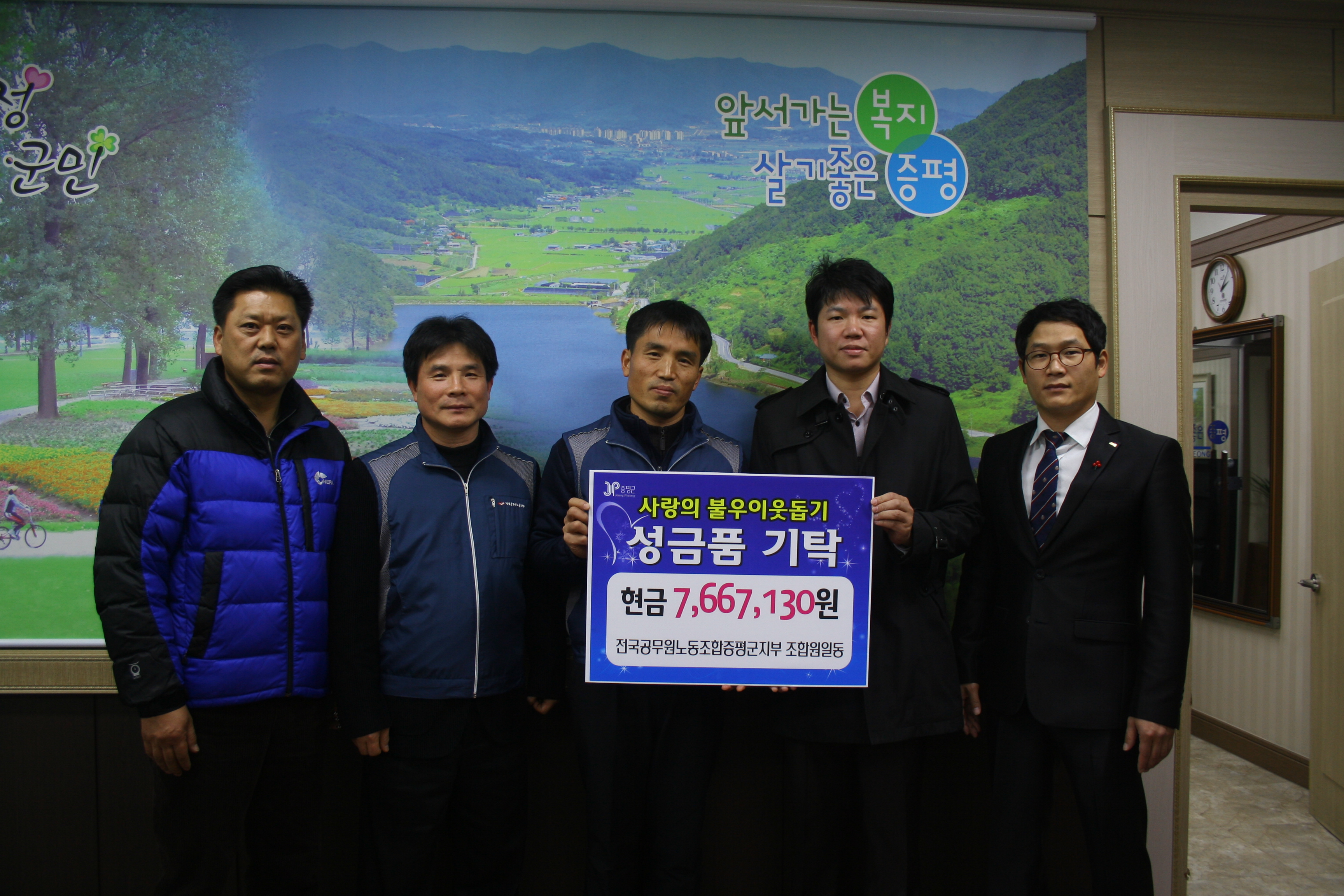 전국공무원노조 충북본부 증평군지부(지부장 이강용)는 16일 군수 접견실에서 지난 4일 불우이웃돕기 위한 일일호프를 통해 얻은 수익금 766만7130원 전액을 증평군 저소득 아동을 위한 후원금으로 전달했다. [증평보도자료실 참조]