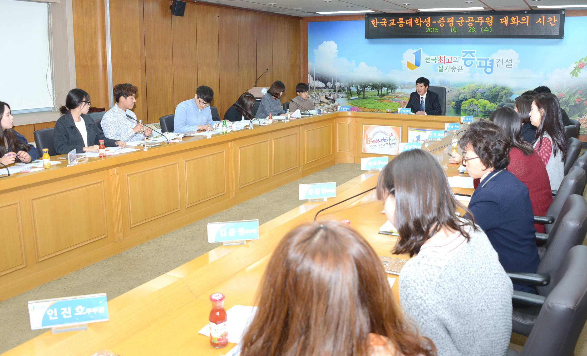 증평군은 28일 오전 10시 30분 군청 소회의실에서 한국교통대학교 사회복지학과 학생 10명을 초청해 전국 최고의 살기좋은 증평건설을 위한‘정책아이디어 발굴 대학생 - 공무원간 대화의 시간’을 가졌다.[보도잘실 참조]