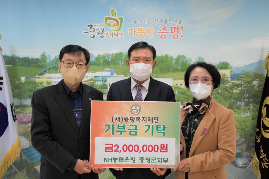NH농협은행 증평군지부(지부장 한용구)는 어려운 이웃을 위해 써달라며 (재)증평복지재단(이사장 이흥식)에 기부금 200만원을 전달했다.