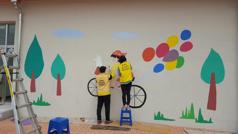 증평군보건소(보건소장 이상숙)와 증평군 정신건강증진센터(센터장 김민경)는‘2016년 공감 프로젝트 – 희망을 그리다’의 사업 일환으로 23일과 25일 이틀간 지역 내 안전 취약지구에 벽화 그리기를 실시했다.