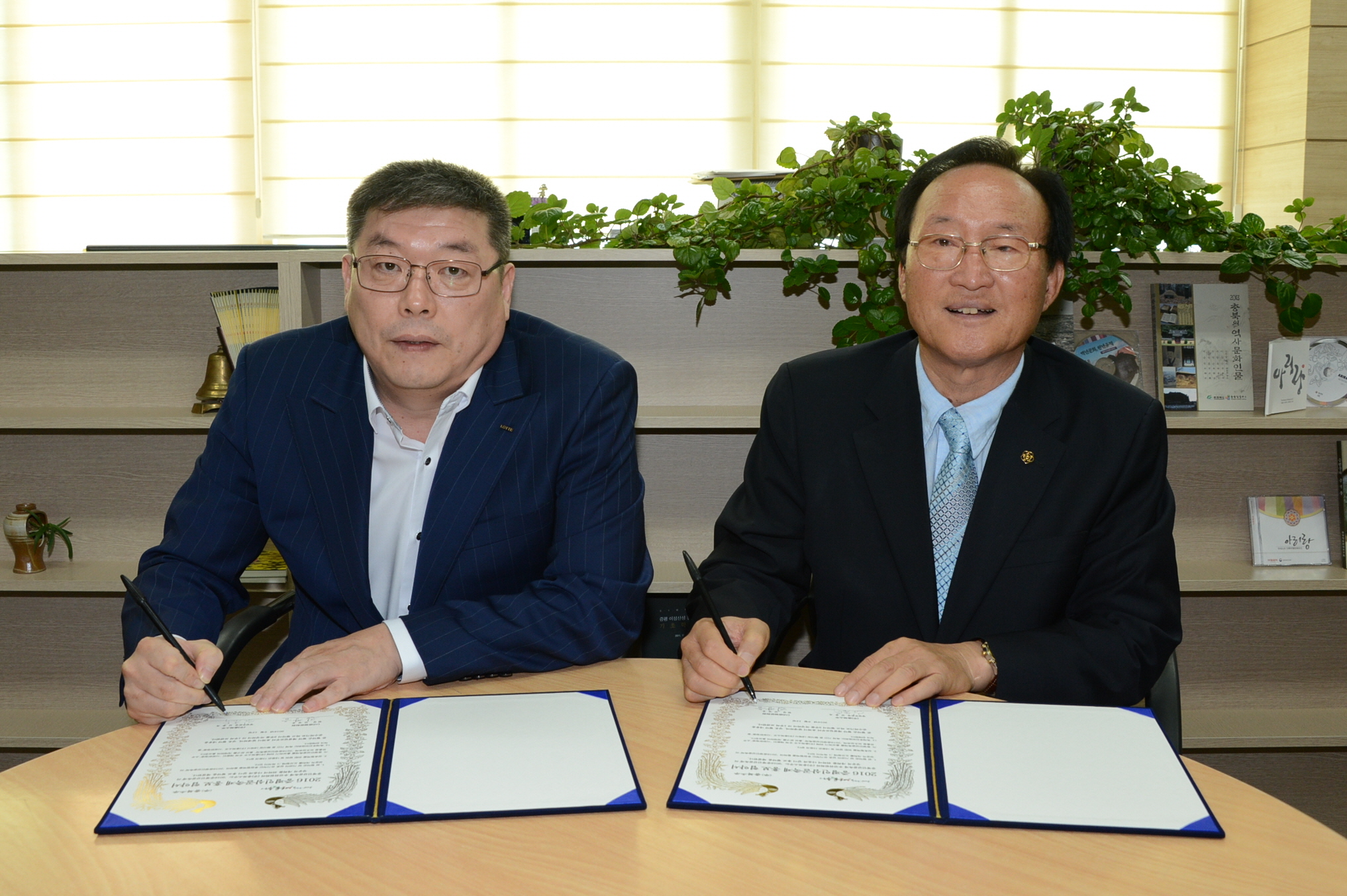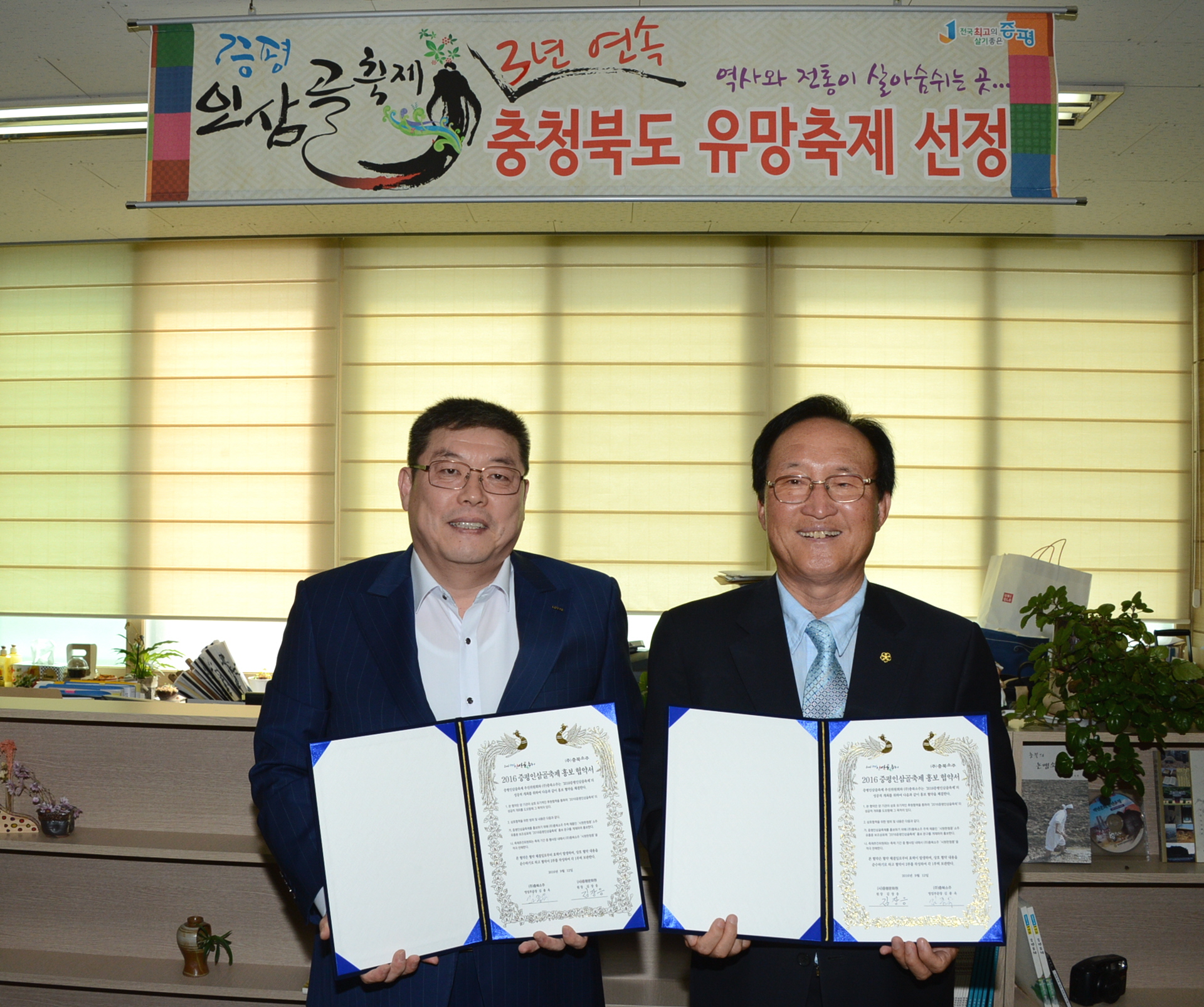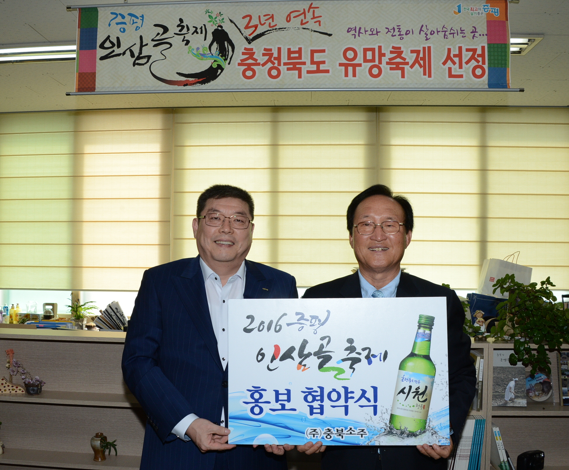 김장응 증평문화원장, 충북소주 이재혁 대표이사는 12일 오후 2시 증평문화원에서 2016 증평인삼골축제 홍보를 적극 지원하기로 하고, ‘시원한 청풍’ 소주병 보조라벨 전달식 및 홍보 협약식을 가졌다[보도자료실 참조]