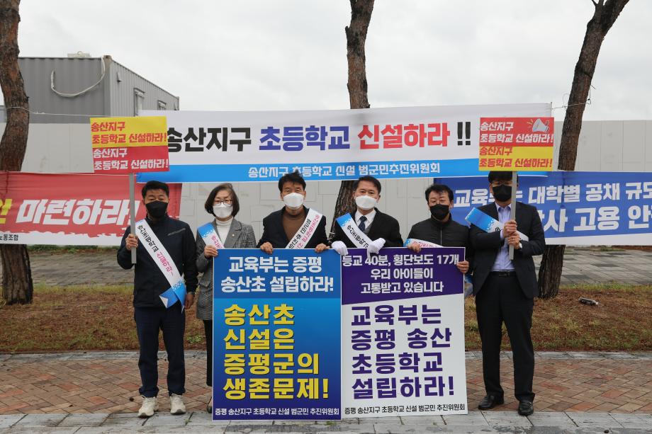 증평송산초신설범군민추진위원회(공동대표 이상호 김장응 이갑순 송규영 김규환 이문재)가 증평 송산지구 내 초등학교 신설을 촉구하는 피켓 시위를 진행했다.