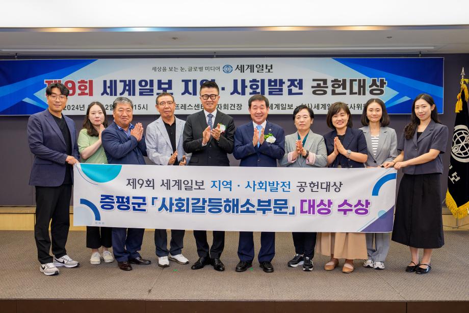 충북 증평군이 12일 한국프레스센터에서 열린 ‘제9회 지역·사회발전 공헌대상 시상식’에서 ‘사회갈등해소부문’대상을 수상했다.
