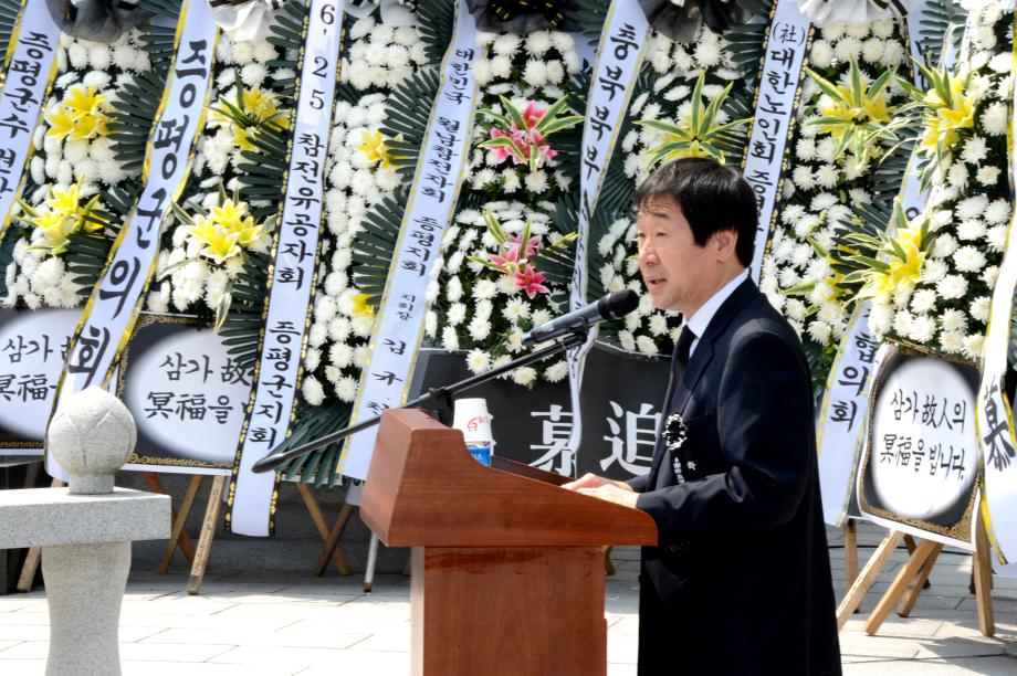 증평군은 6일 제63회 현충일을 맞아 증평읍 내성리 증평보건복지타운 내 충혼탑에서 나라를 위해 몸 바친 순국선열 및 호국영령들을 기리는 추념 행사를 개최했다.(보도자료실 참조)