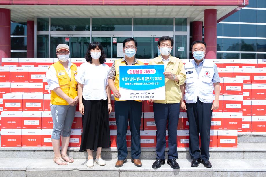 대한적십자사 충북지사(회장 김경배)는 20일 생필품 372상자(744만원)를 증평군에 전달했다.
