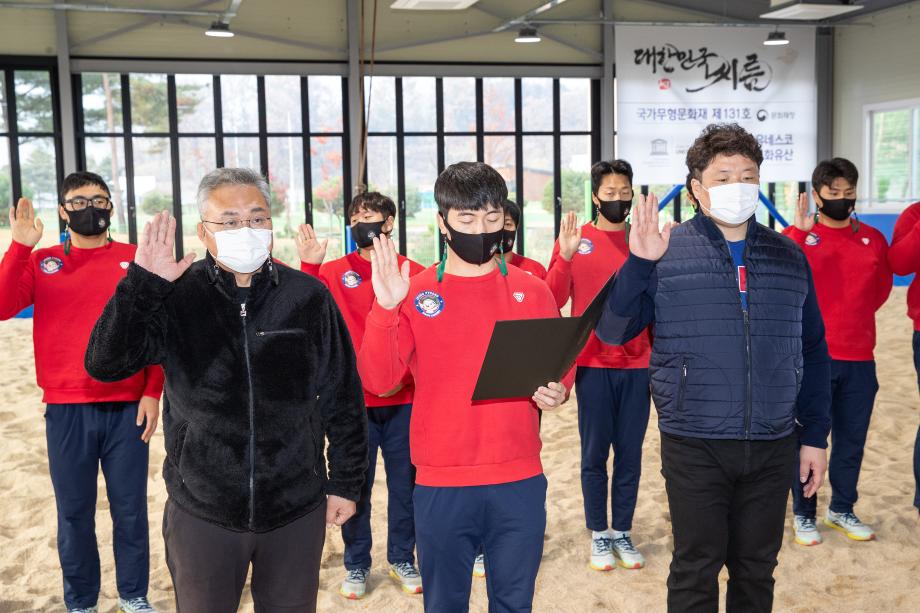증평군청인삼씨름단 선수단 12명은 13일 증평군인삼씨름장에서 씨름단장인 홍성열 군수가 함께한 가운데 스포츠 폭력추방 결의를 다졌다.