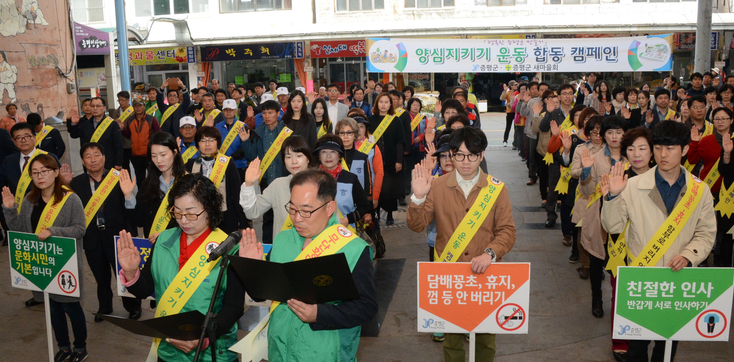 증평군은 오전 9시 30분부터 증평장뜰시장 다목적 광장에서 공무원과 각 기관・사회단체 회원 등 200여명이 참석한 가운데 ‘양심 지키기 운동 합동 캠페인’을 가졌다.[보도자료실 참조]