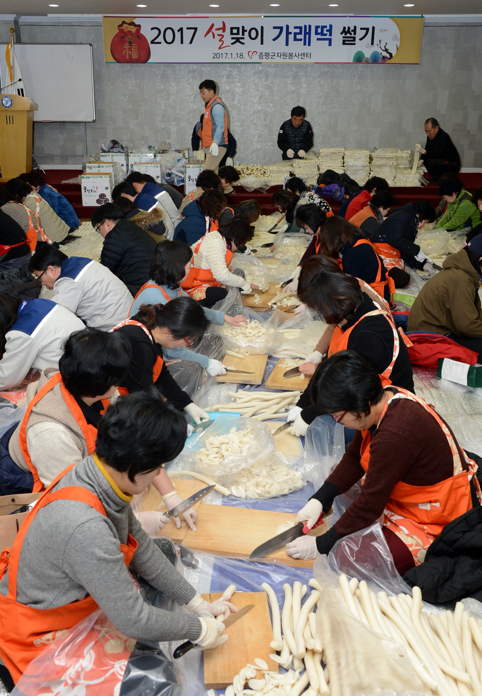 증평군자원봉사종합센터(센터장.김남순)는 18일 오전 10시 증평군 여성회관에 100여명의 기업봉사자와 여성단체 회원, 자원봉사자들이 참여한 가운데 지역사회 소외계층을 위한‘설맞이 사랑의 떡썰기 행사’를 가졌다.[보도자료실 참조]