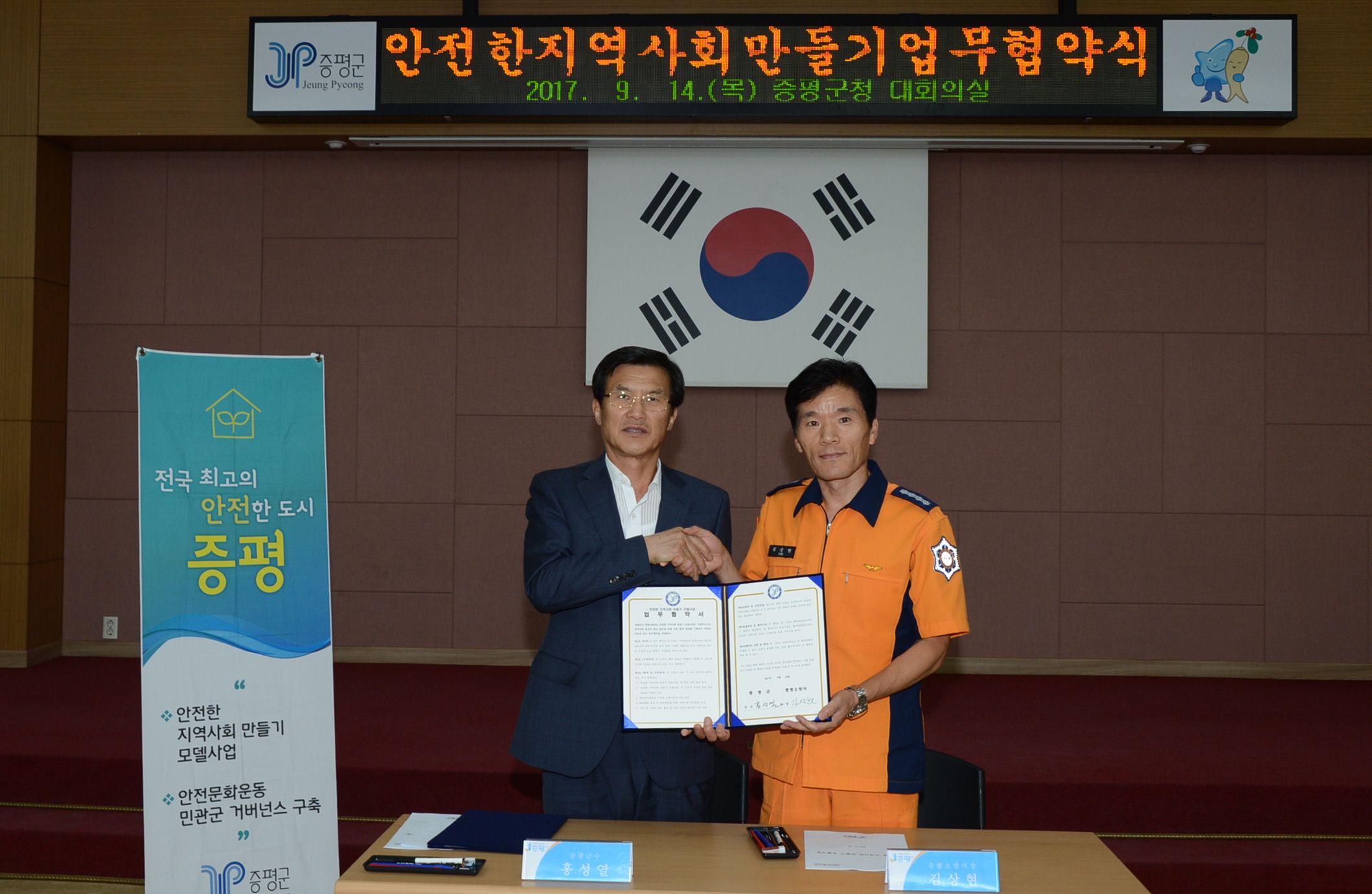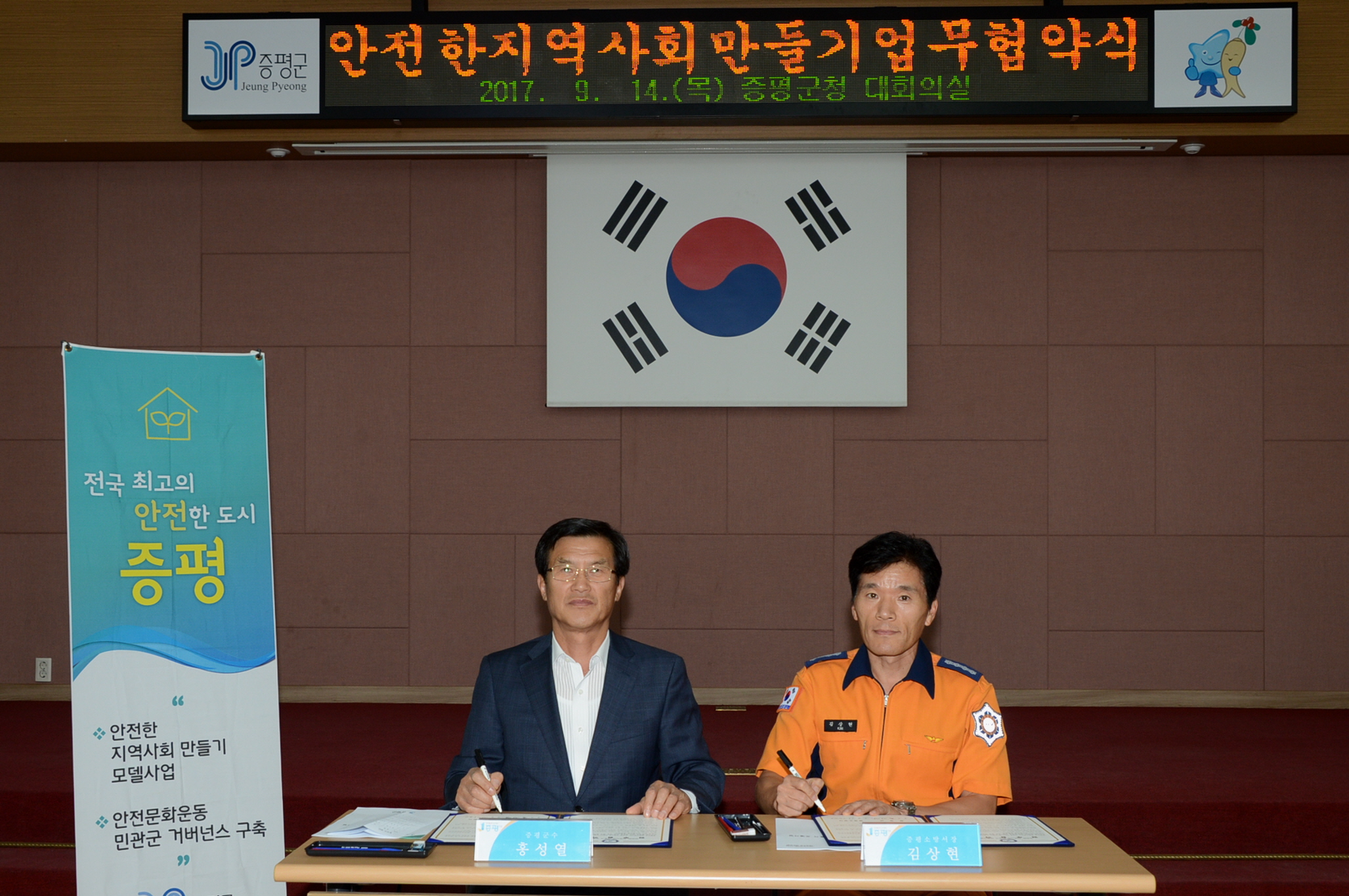 증평군은 안전한 지역사회 만들기 모델사업의 일환으로 14일 군청 대회의실에서 증평소방서와 화재예방 인프라 구축을 위한 업무협약을 체결했다.(보도자료실 참조)