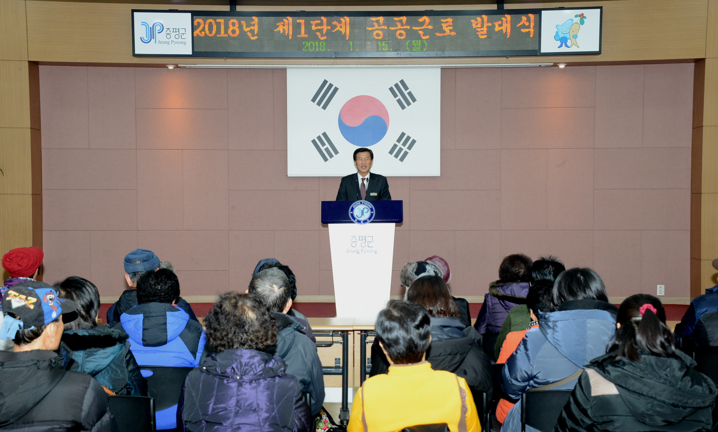 증평군은 15일 군청 2층 회의실에서 2018년도 ‘제1단계 공공근로사업 발대식’을 갖고 공공근로사업을 통해 지역 내 취약계층의 경제적 자립기반 마련과 생활안정화에 주력키로 했다.(보도자료실 참조)