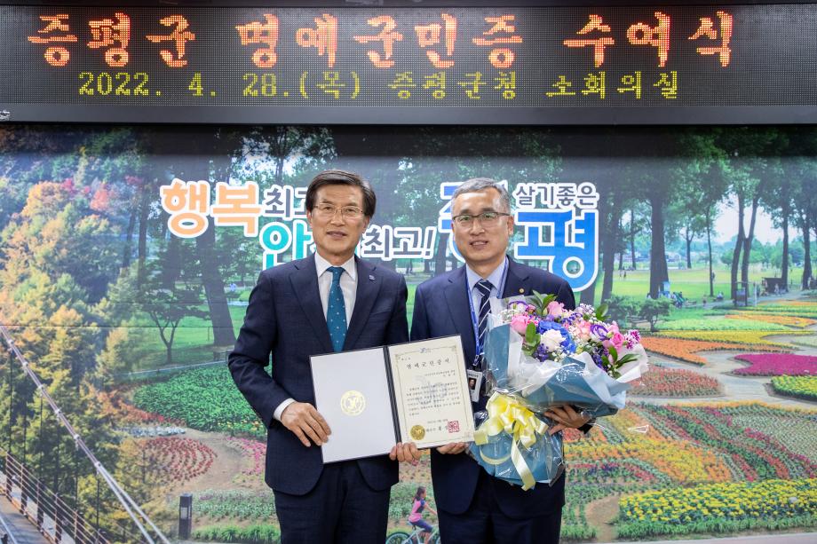 증평군(군수 홍성열)이 28일 증평군 명예군민증 수여식을 열어 충북연구원 원광희(58세) 지역발전연구센터장과 국민독서문화진흥회 김을호(58세) 회장에게 명예군민증을 전달했다.