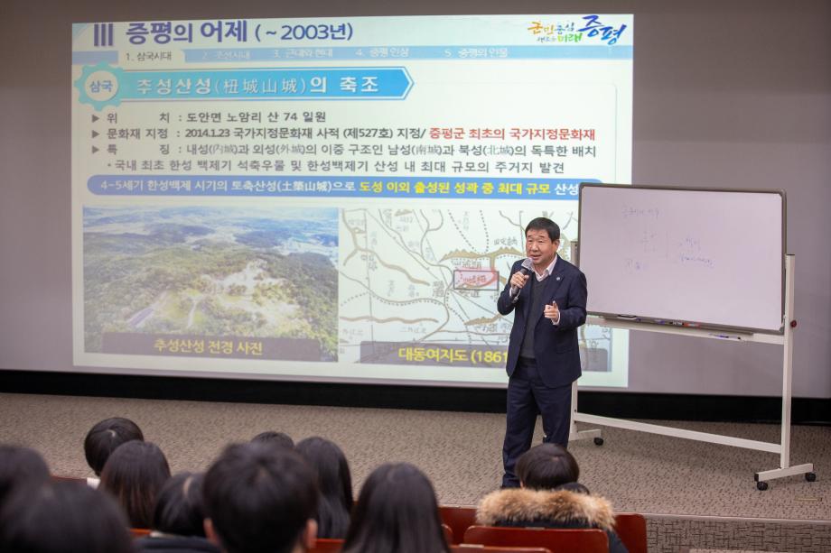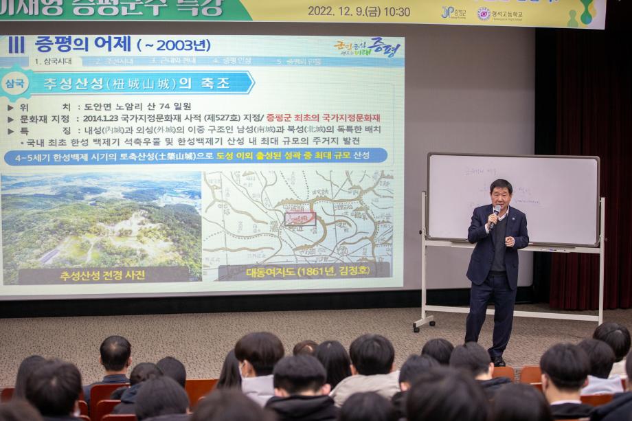이재영 증평군수가 9일 증평군립도서관에서 형석고등학교 3학년 학생들을 대상으로 특강을 진행했다.