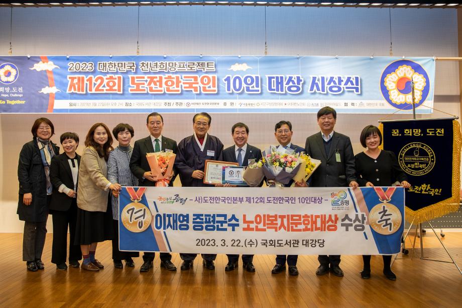 이재영 증평군수는 22일 국회도서관 대강당에서 (사)도전한국인본부가 주최하는 제12회 도전한국인 10인 대상에서 노인복지문화대상을 수상했다.