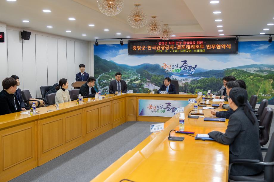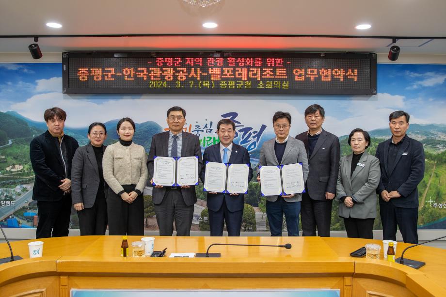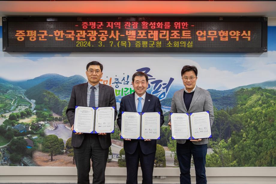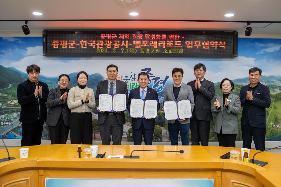충북 증평군은 7일 군청 소회의실에서 한국관광공사 세종충북지사와 벨포레리조트 간 지역 관광 활성화를 위한 ‘강소형 잠재관광지 발굴·육성’업무협약을 체결했다.