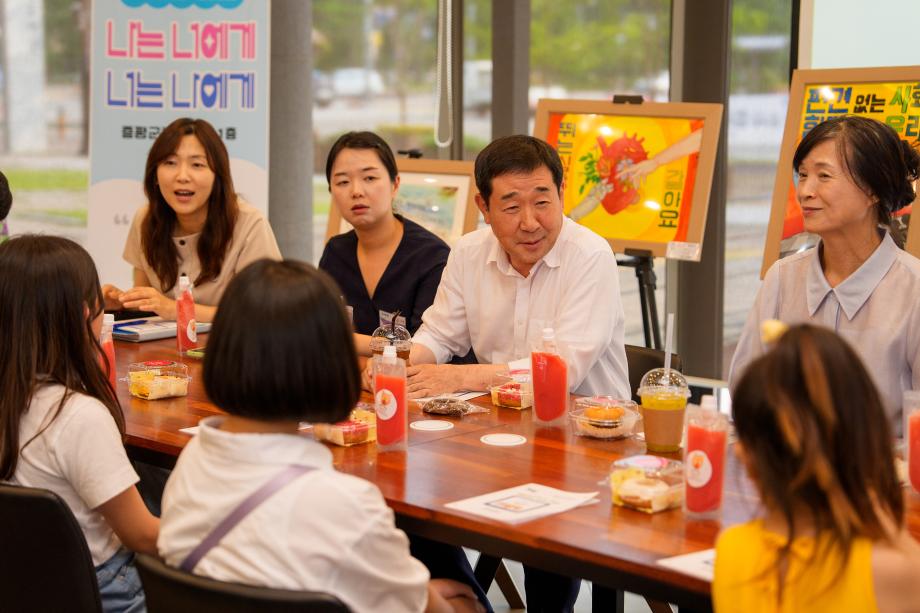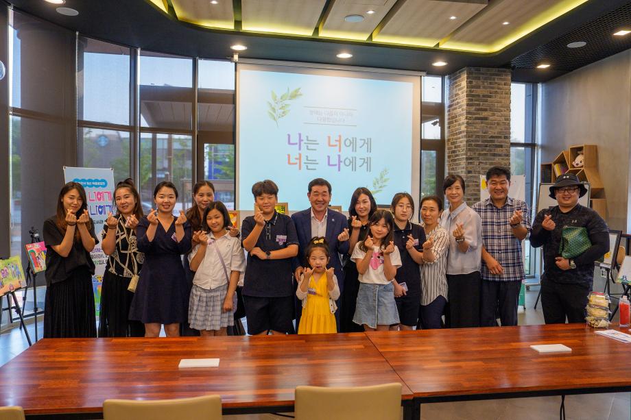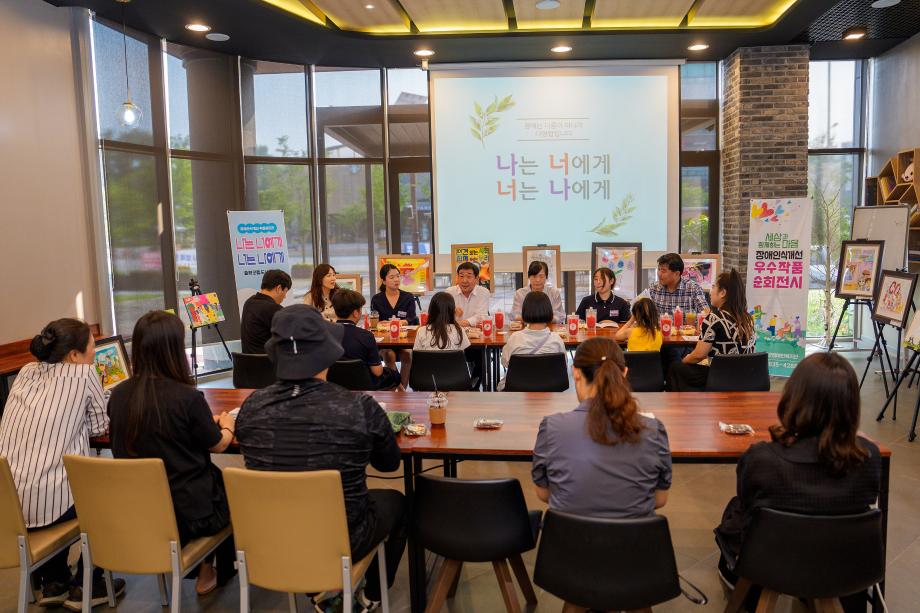 이재영 증평군수가 12일 군립도서관 1층 북카페에서 ‘나는 너에게, 너는 나에게’를 주제로 장애인식개선 작품공모전 수상자와 이야기 나누는 시간을 가졌다.