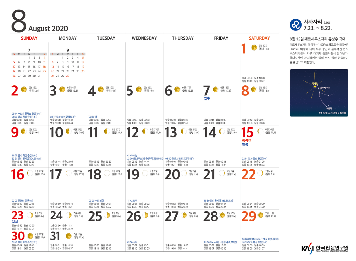 2020년 8월 천체현상 및 주요 천체관측대상입니다.