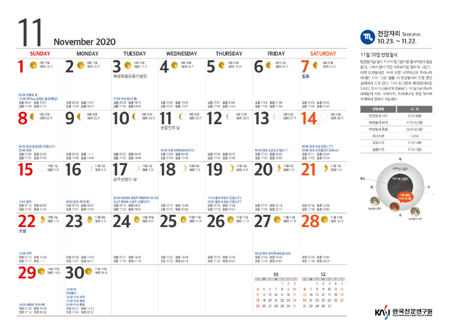 2020년 11월 천체현상 및 주요 천체관측대상입니다.
