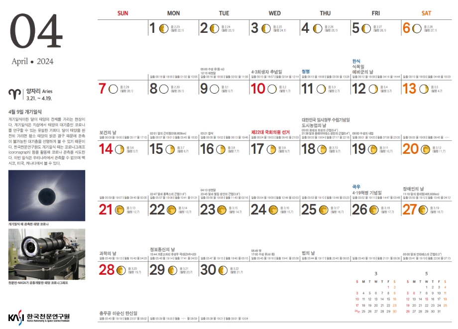 2024년 4월 천체관측대상과 천체현상입니다.